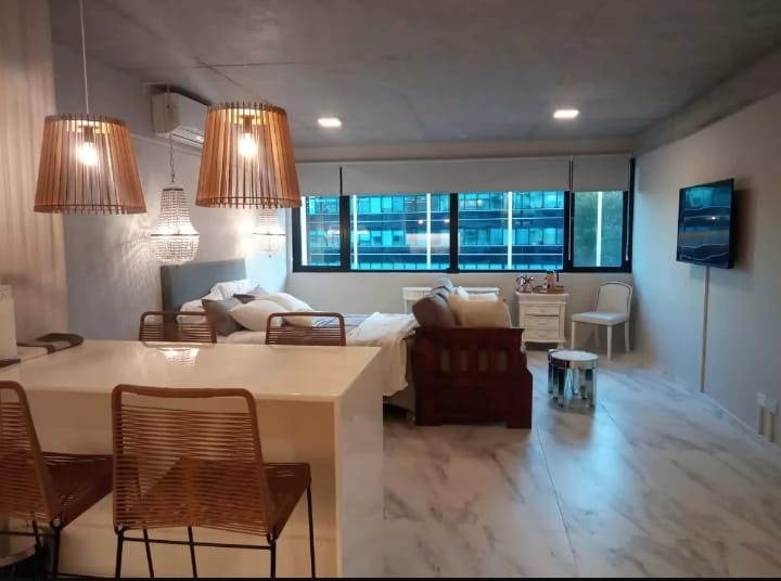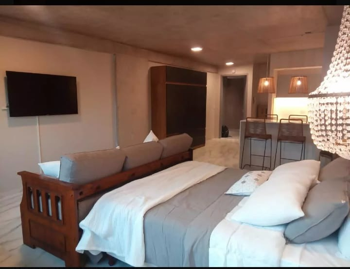En el sector del living se encuentra un sillón de 3 cuerpos super cómodo y televisión led .mediante soporte en la pared. Ofrece placard y baño completo impecable.