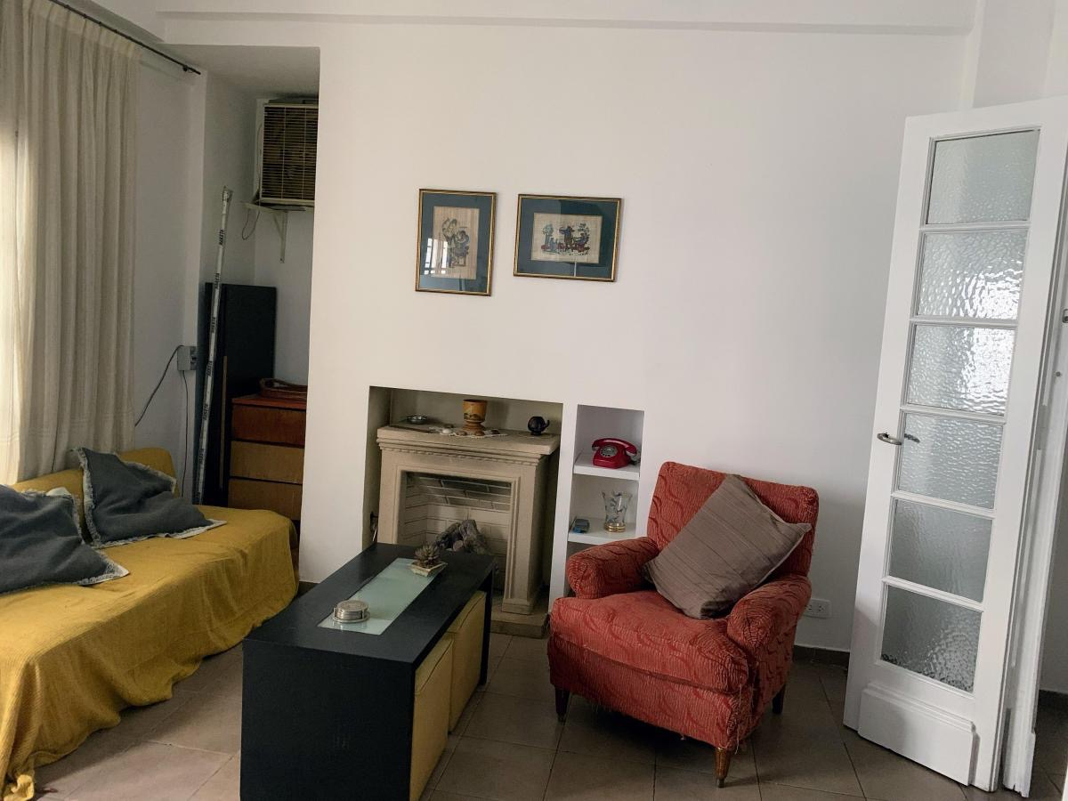 El departamento cuenta con living con chimenea, sillones, mesa ratona, ventilador, cuadros decorativos.