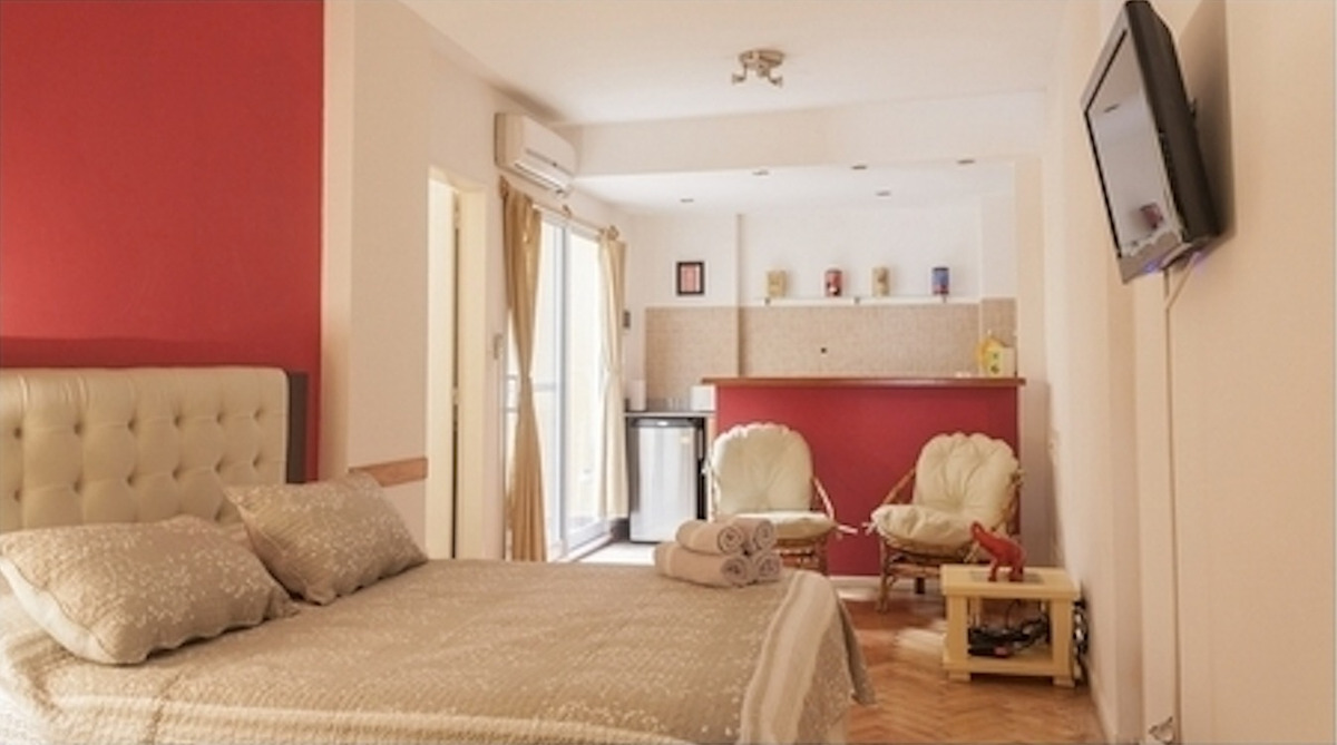 Departamento de un ambiente con patio privado, equipado con muebles de exterior, Cocina con integrada, heladera bajomesada, anafe, microondas, tostadora, cafetera y vajilla completa. Sector dormitorio con cama king Size (o 2 individuales). Barra desayunadora. TV. Calefacción central y aire acondicionado. Caja de seguridad. Ropa de cama y toallas.