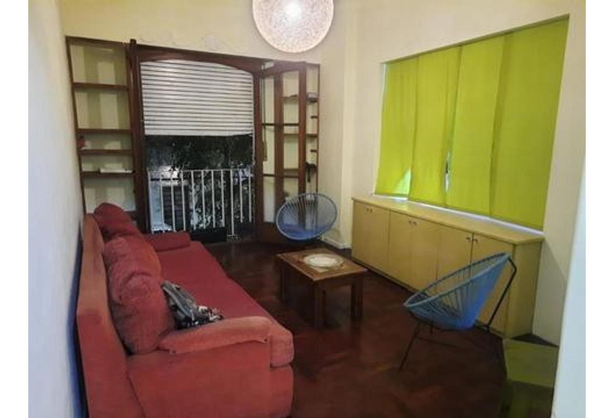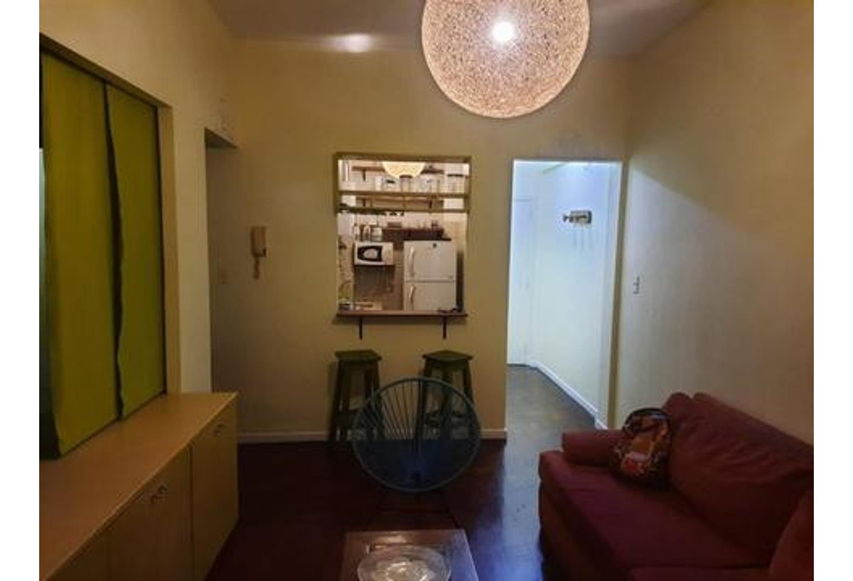 -Living-comedor cuanta con un sofá de dos cuerpos , desayunador rectangular con sus respectivas sillas, son salida al balcón francés