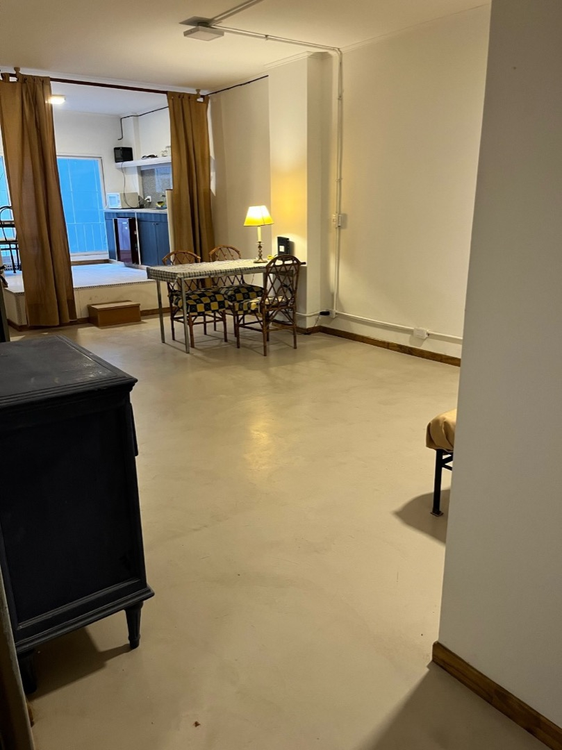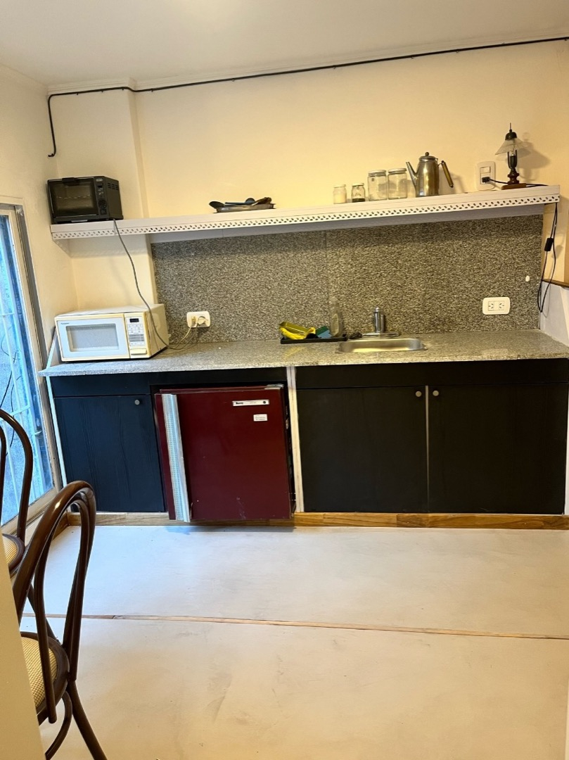 El departamento cuenta una habitación con cama matrimonial, mesa de luz, living con mesa y sillas. Cocina con bajo mesada, microondas, horno eléctrico, utensilios de cocina.