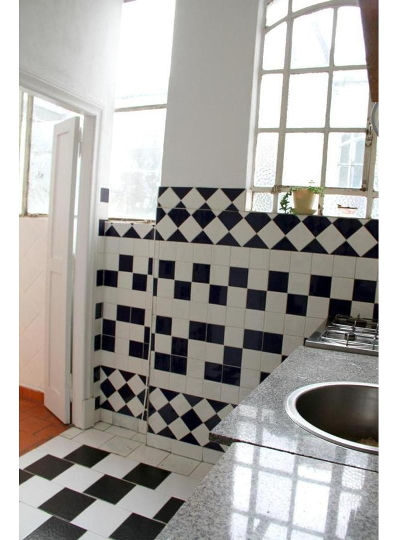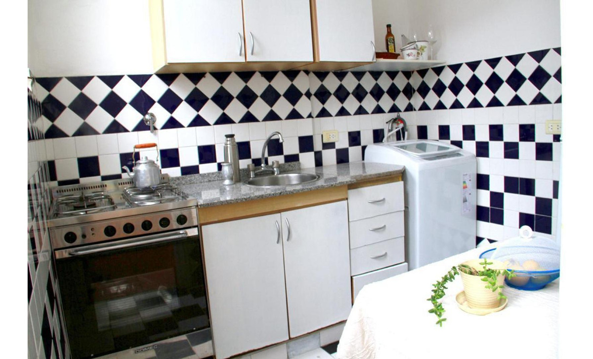 La cocina es amplia entra una mesa con dos sillas para desayunar y hay lavarropa.