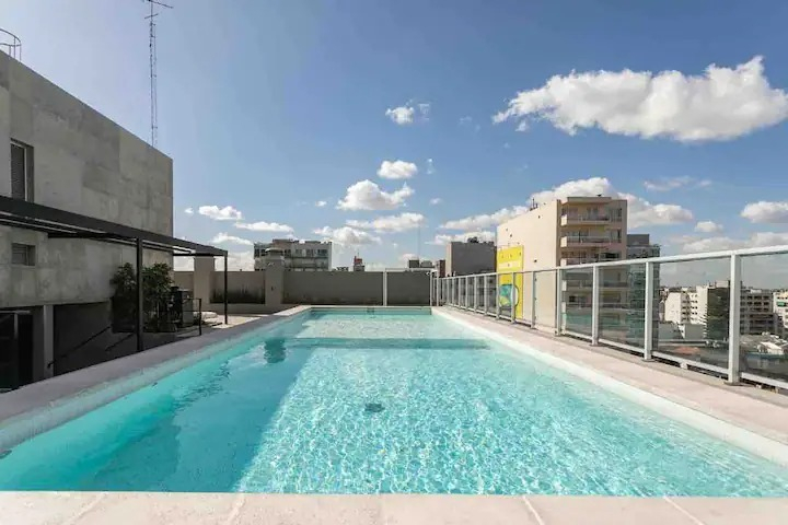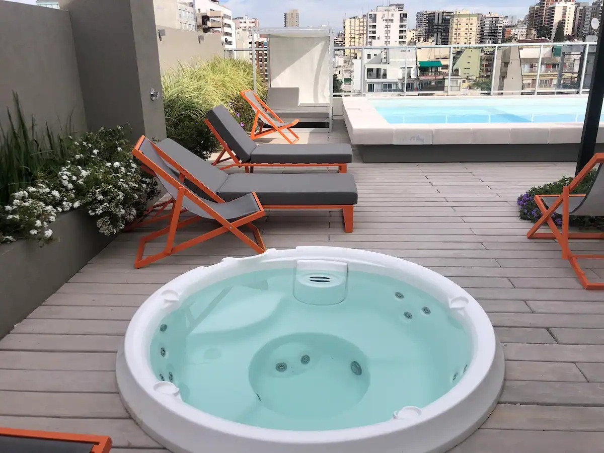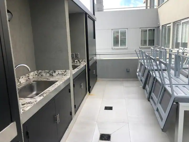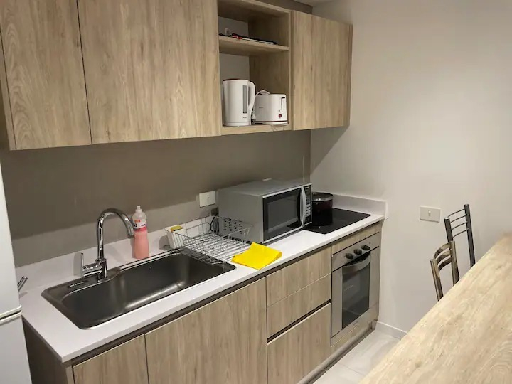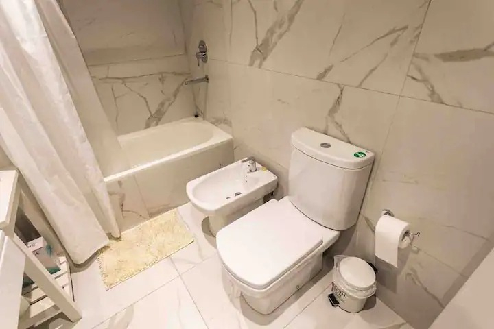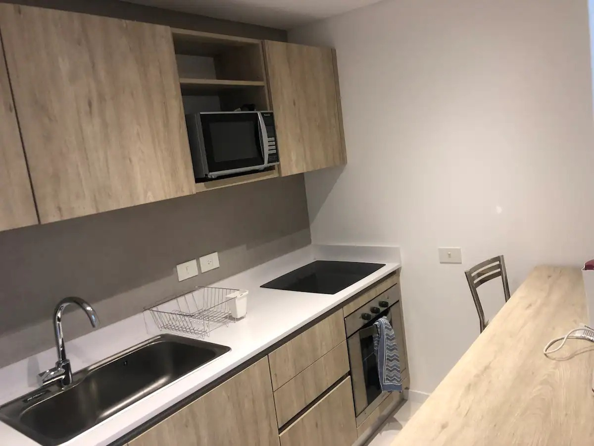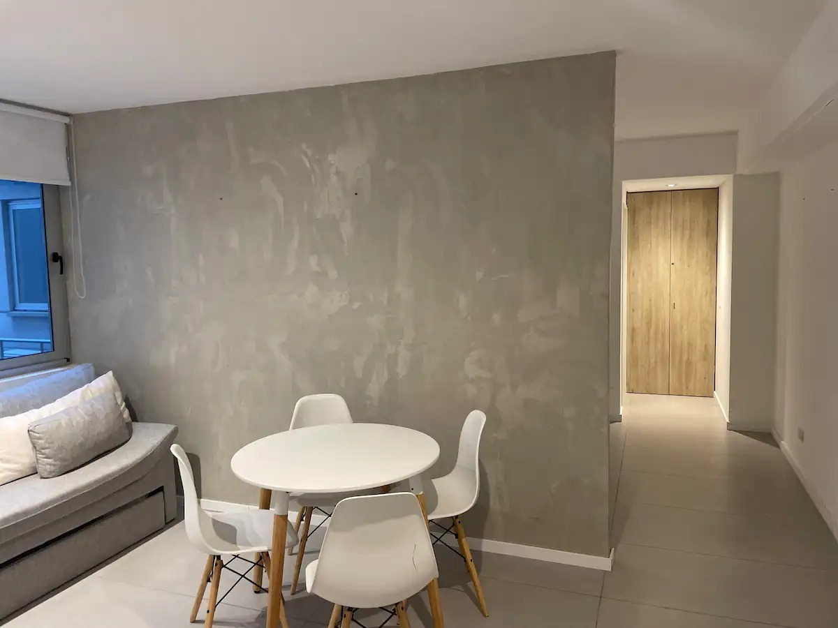 El departamento moderno cuenta con una sala con sillon cama, tv, aire acondicionado y mesa para 4, el dormitorio tiene una cama matrimonial, espacio de guardado, espejo y aire acondicionado, el baño completo (toillete, bidet y bañera) y cocina con heladera, microondas, pava electrica, tostadora y horno.