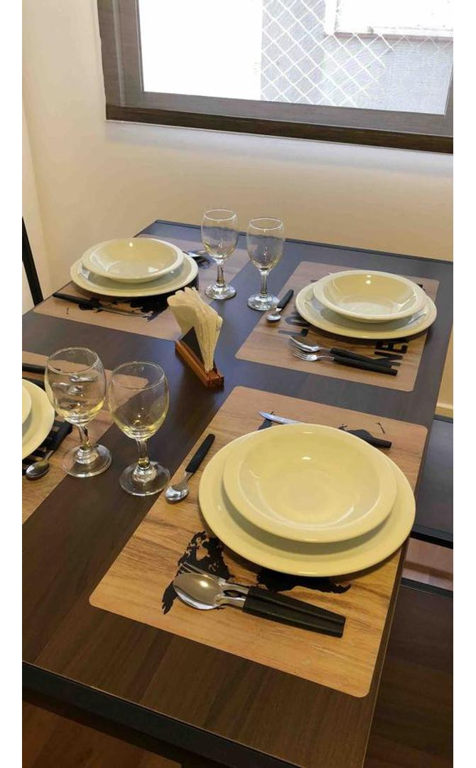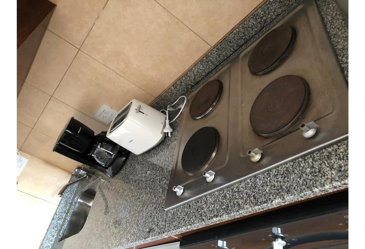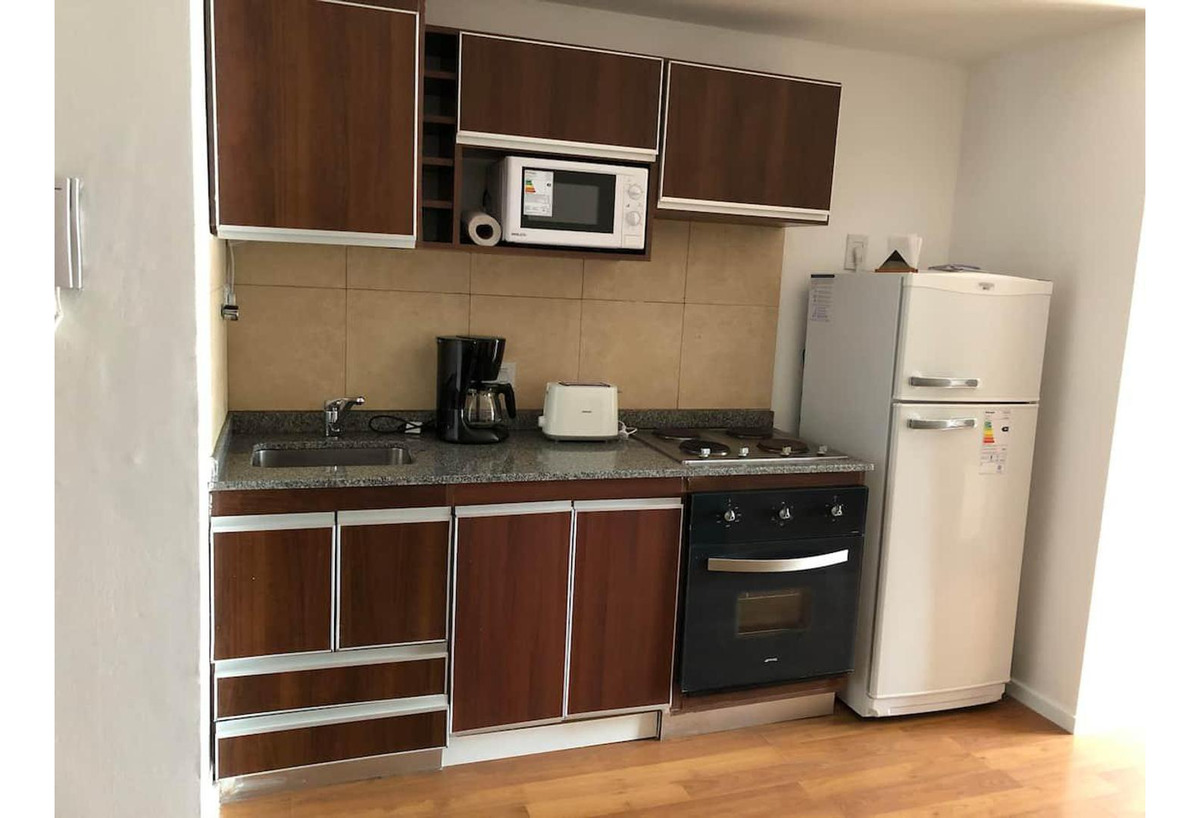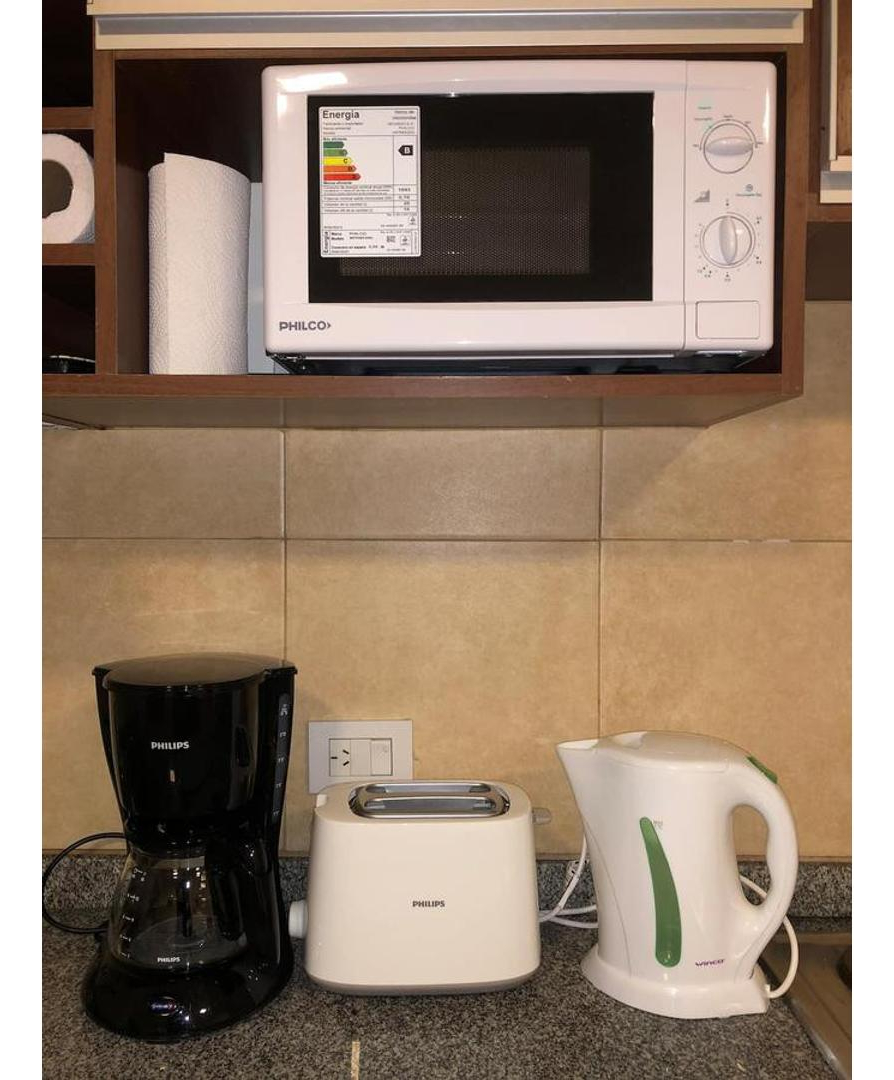 La cocina es integrada y completa con alacenas bajo mesada y sobre mesada, equipada con: vajilla completo, heladera, pava eléctrica, cafetera, microondas, tostadora y cocina con horno.