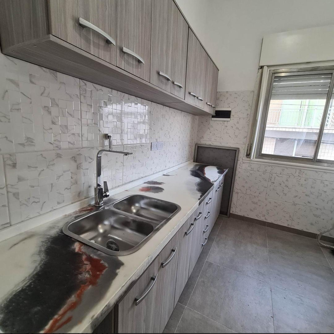 Cocina con muebles de alacena y bajo mesada muy grande que bordea toda la cocina, todo en perfecto estado, mesada de porcelanato, con diseño exclusivo, cocina es muy luminosa.