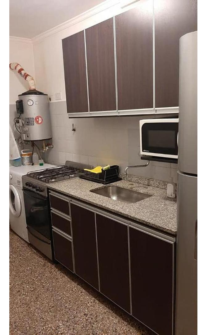 Cocina independiente con muebles bajo mesada y alacenas, equipada con heladera con freezer, microondas y lavarropas.
