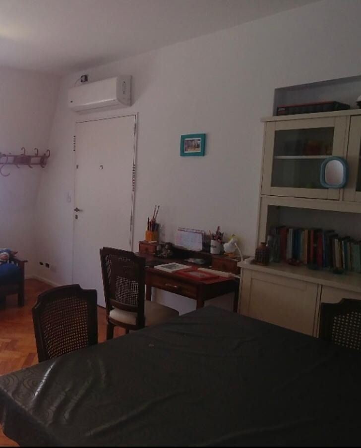 - El living comedor, se encuentra, con mesa de madera grande y 5 sillas, un armario para guardar platos, un sillón cama,perchero,y contiene aire acondicionado.