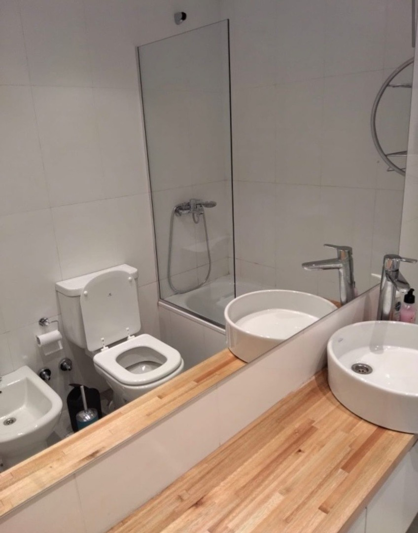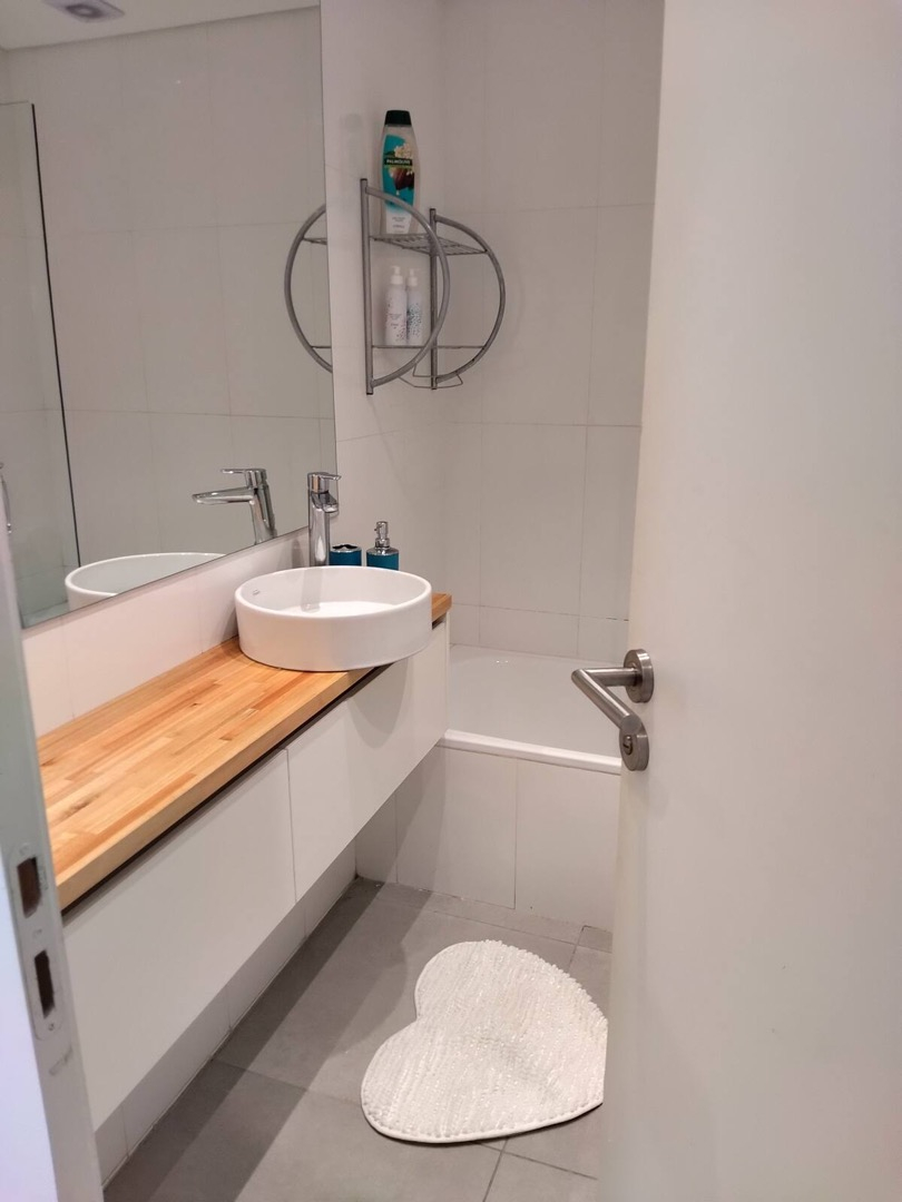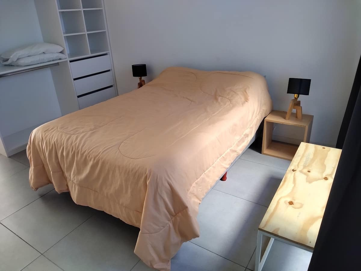 Sector de habitación dividida por placard, con cama matrimonial de dos plazas, placard y mesa de luz. Baño completo con bañera, bidé, inodoro, lava manos con espejo.