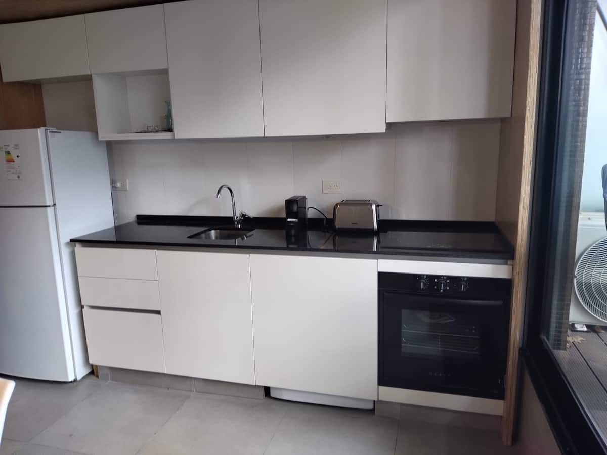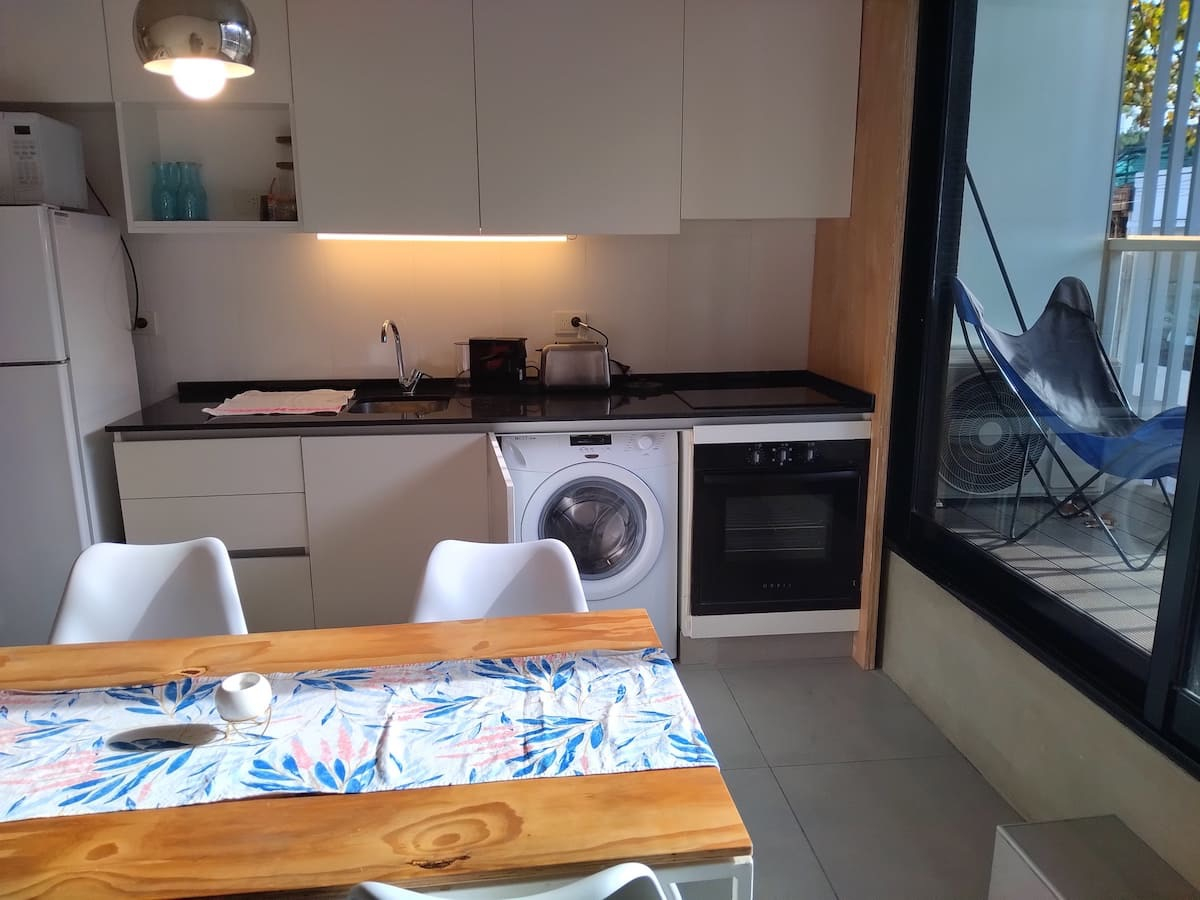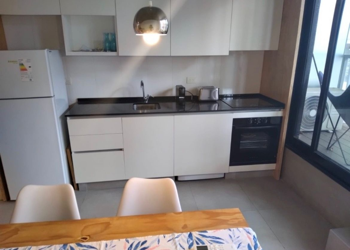 Sector de cocina con bajo mesada, nespresso, pava eléctrica, microondas, alacena, cocina anafe, heladera con frezzer, tostadora, cafeterías, utensilios de cocina.