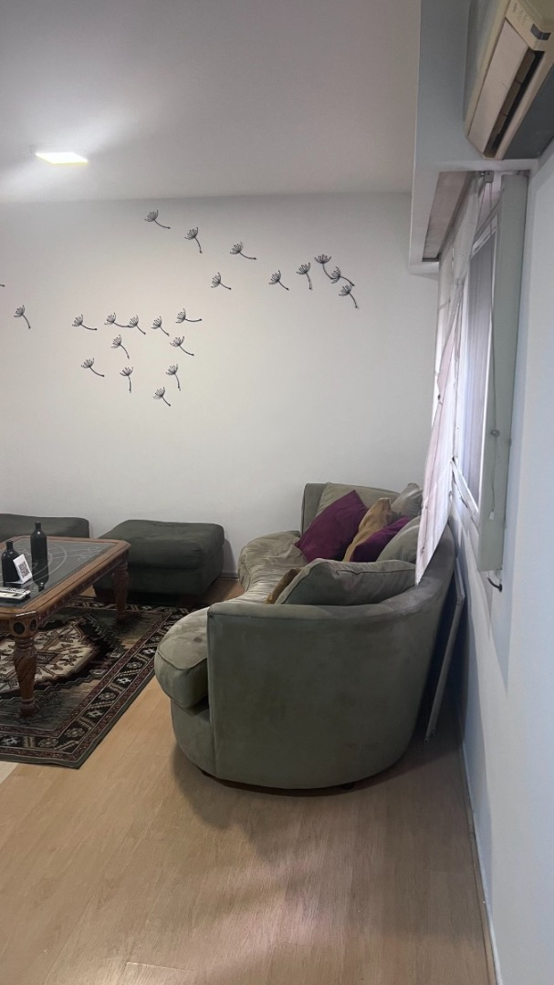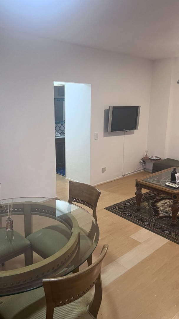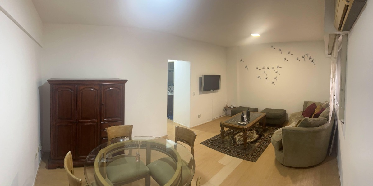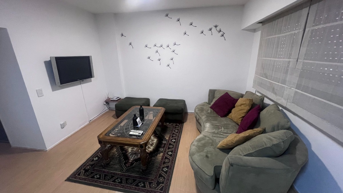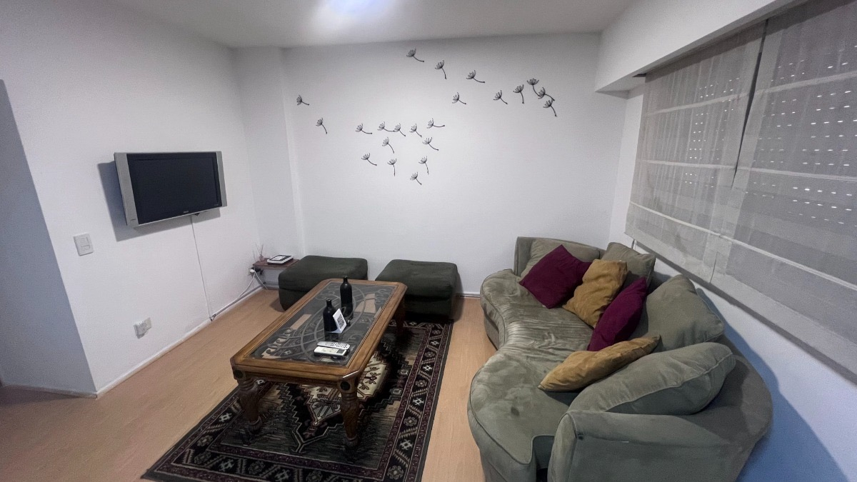 El departamento cuenta con living amplio con sillón de dos cuerpos, mesa ratona con dos futones, televisión, aire acondicionado, mueble, mesa de vidrio con sillas.