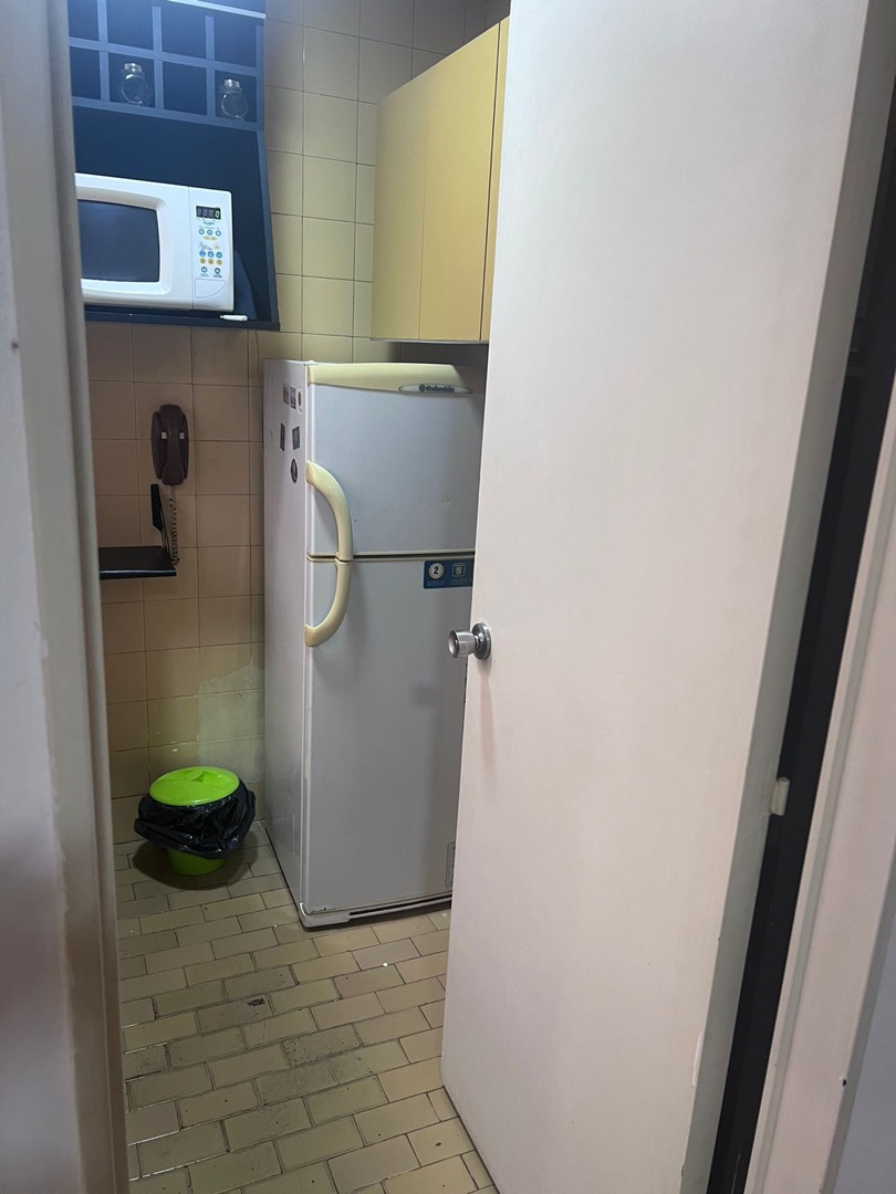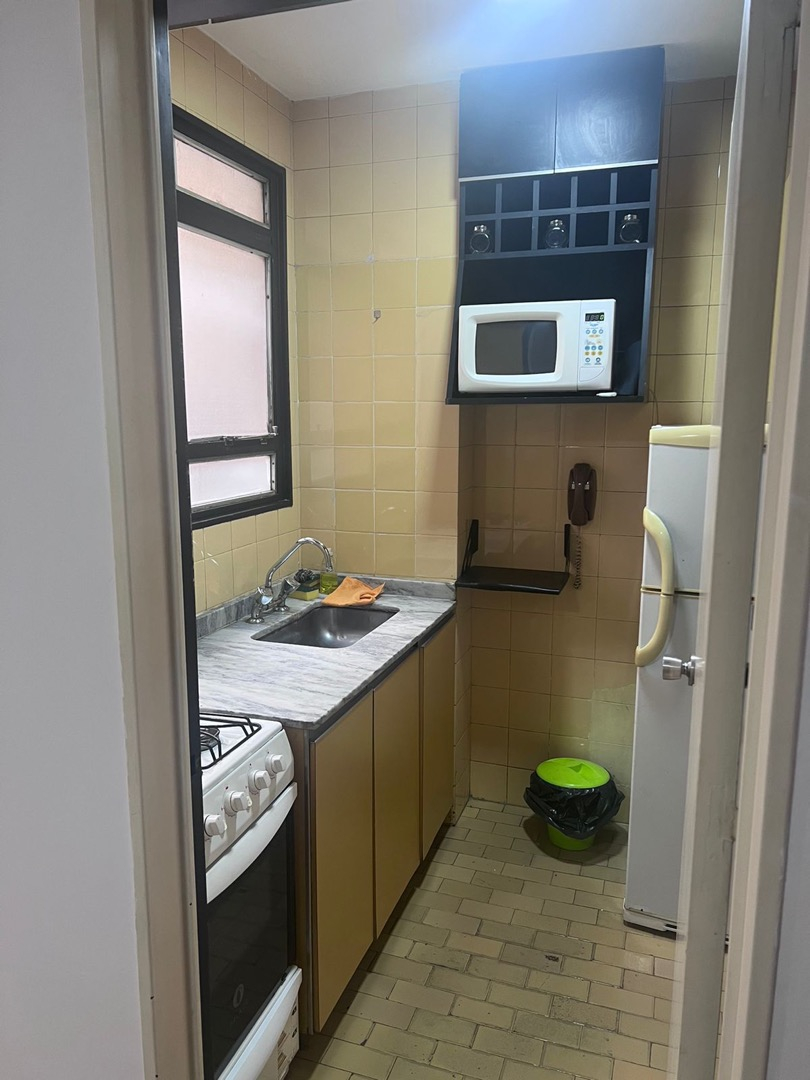 Cocina con heladera con frezzer, cocina con horno a Gas Natural, microondas, utensilio de cocina.