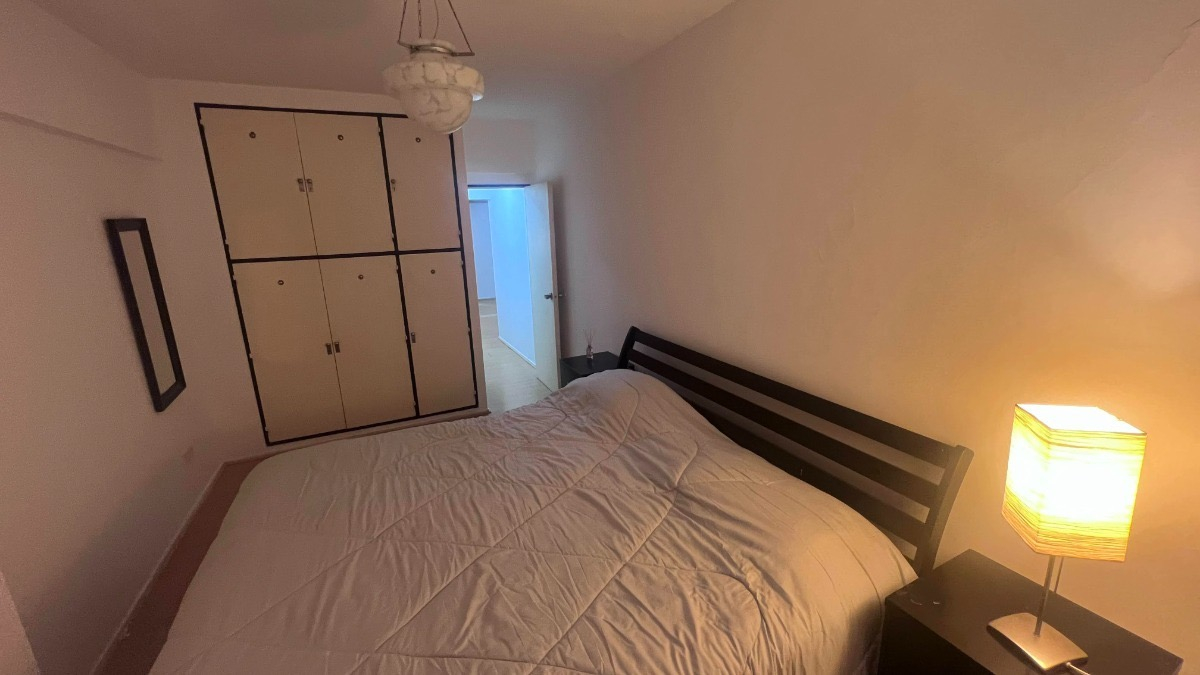 Habitación con cama matrimonial, mesa de luz, respaldo de cama, espejo, placar.