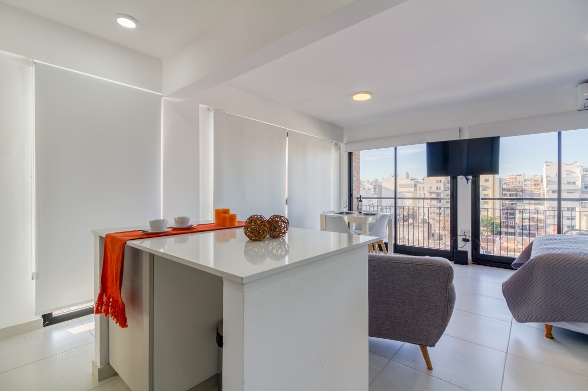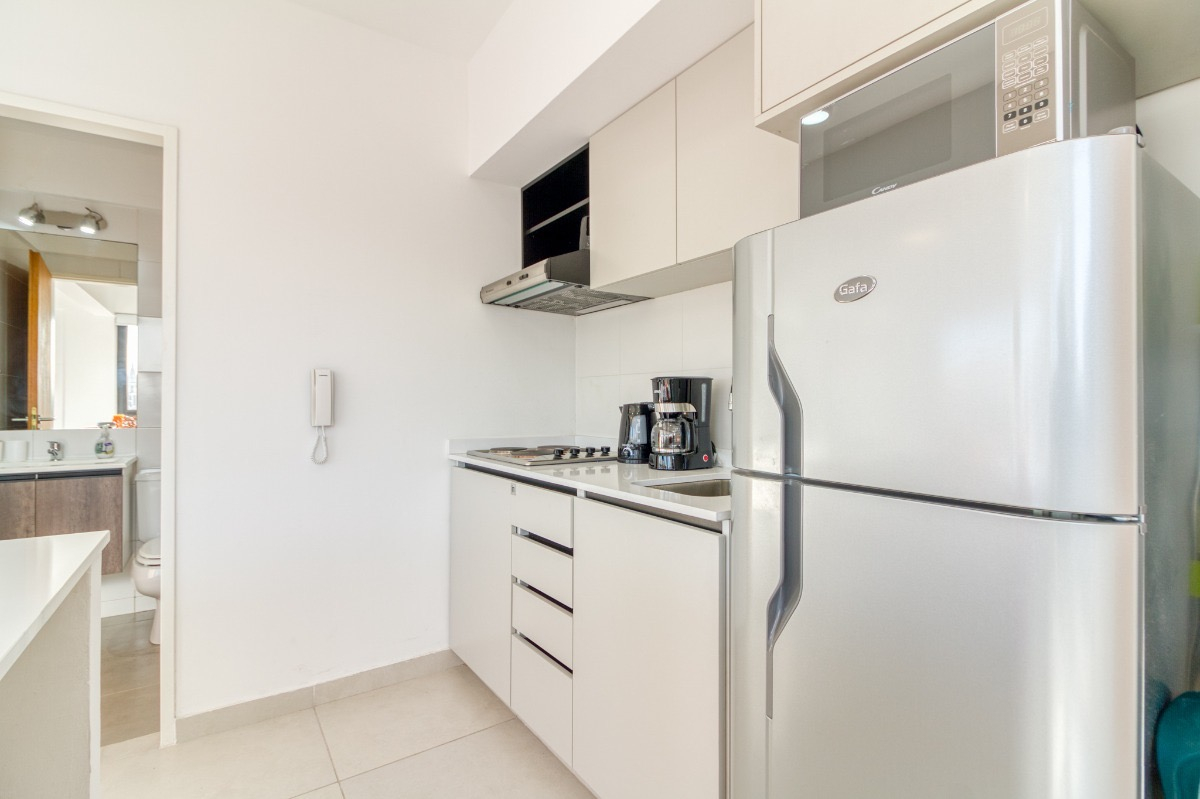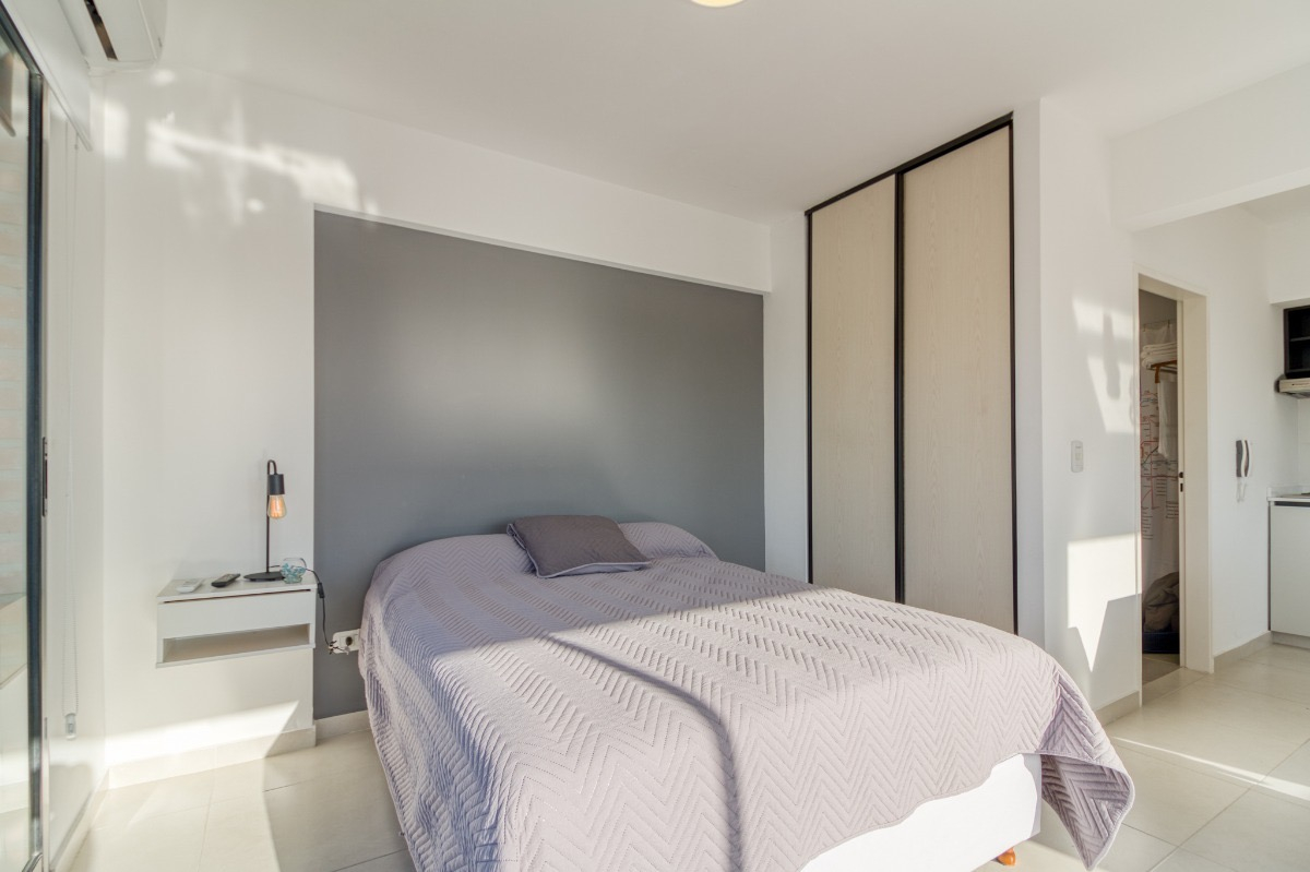 El departamento, cuenta con cama Queen Size de dos plazas, mesa de luz, aire acondicionado, placard, ventanales al costado muy luminoso, televisión, mesa y sillas de estilo nórdico, dos sillones de un cuerpo, cortinas roller, Cocina equipada con anafe eléctrico, microondas, heladera con frezzer, utensilios, vajilla para dos personas, extractor de humo.