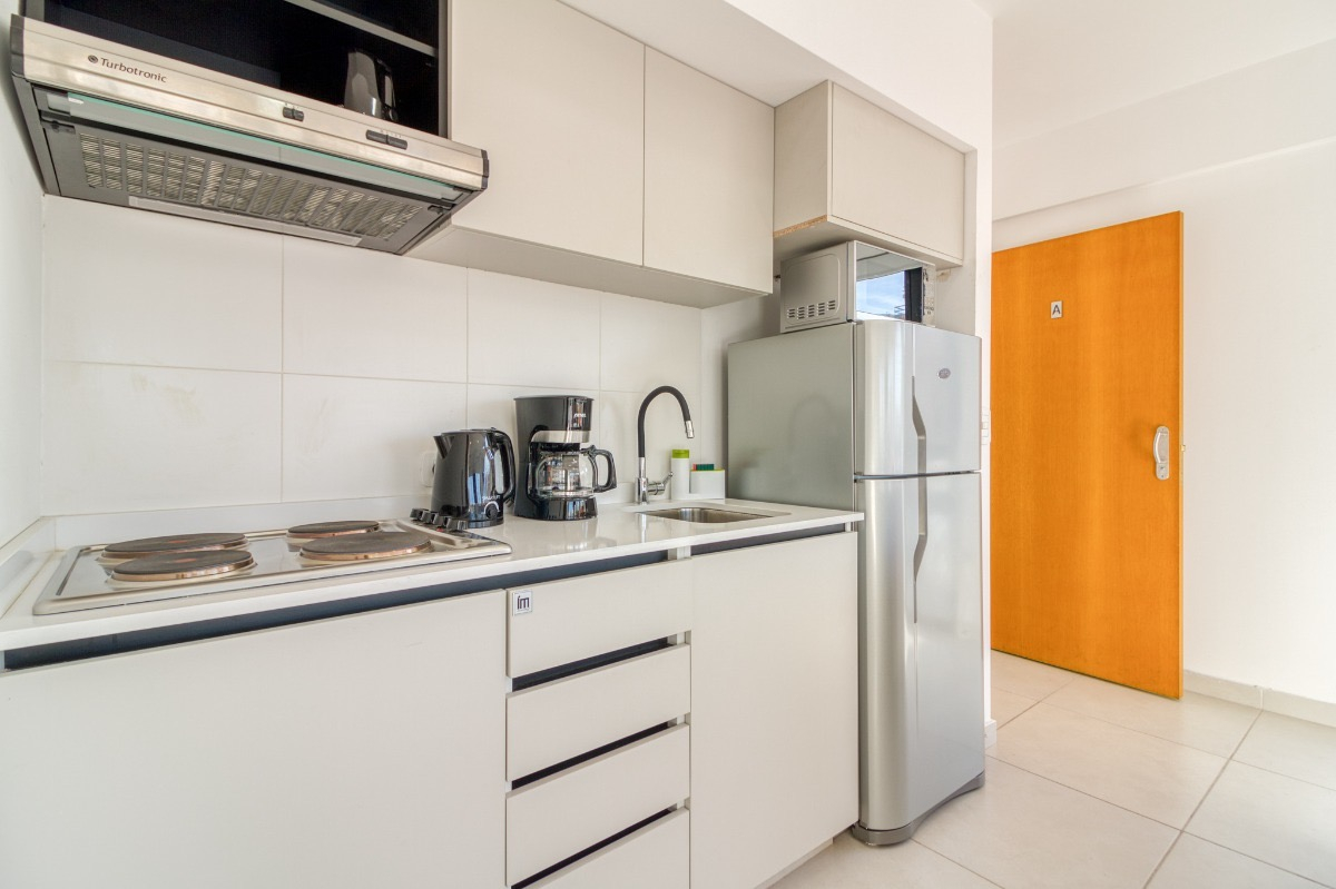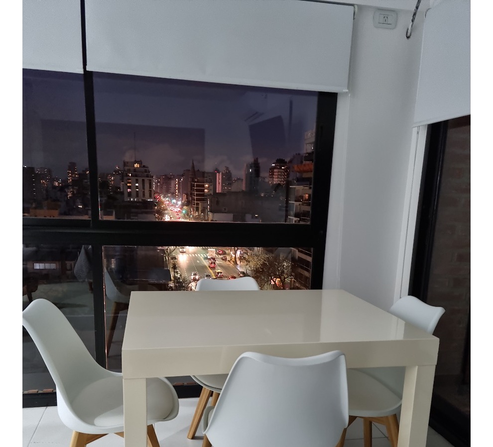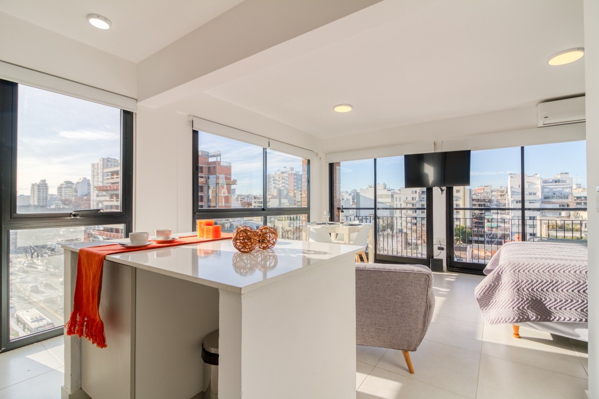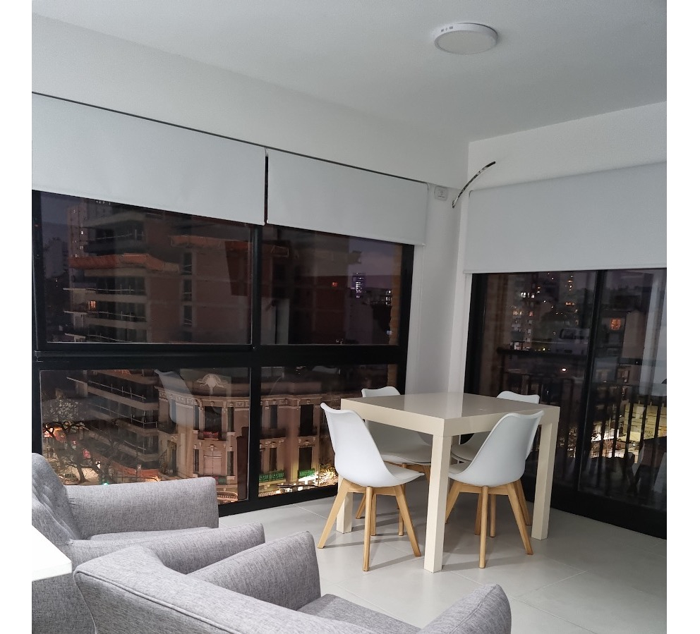 El departamento, cuenta con cama Queen Size de dos plazas, mesa de luz, aire acondicionado, placard, ventanales al costado muy luminoso, televisión, mesa y sillas de estilo nórdico, dos sillones de un cuerpo, cortinas roller, Cocina equipada con anafe eléctrico, microondas, heladera con frezzer, utensilios, vajilla para dos personas, extractor de humo.