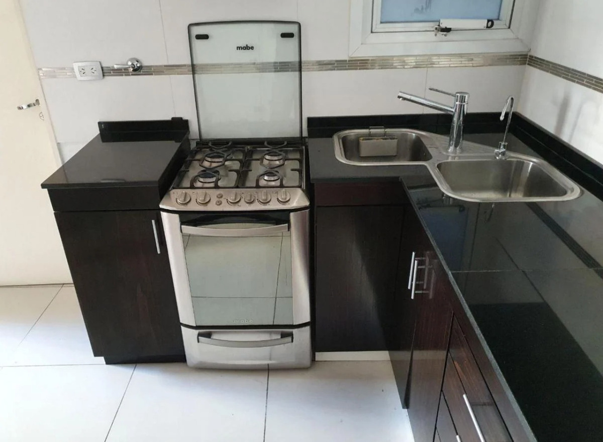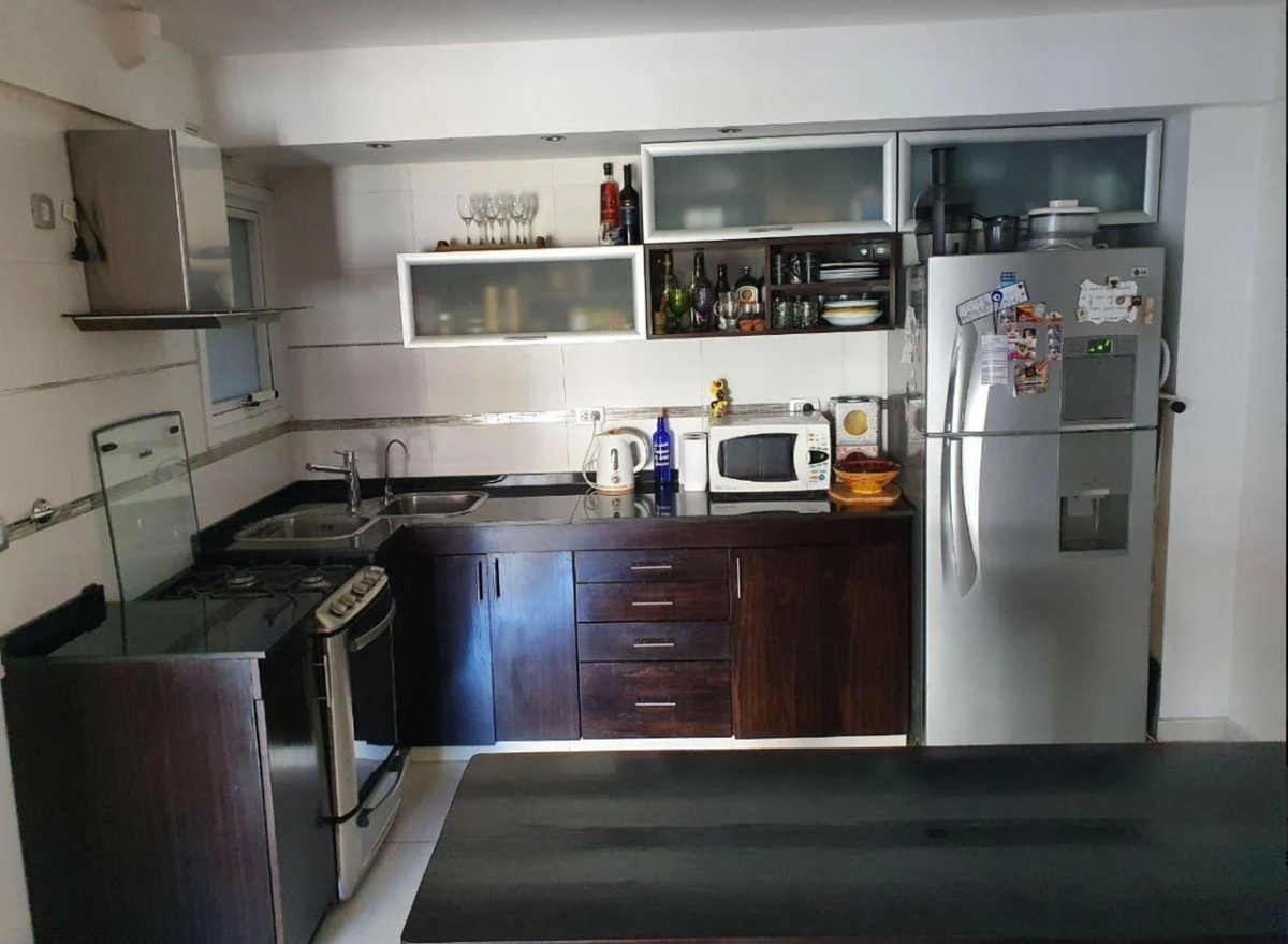La cocina esta integrada al living mediante una barra desayunador y esta equipada con doble horno a gas y eléctrico, heladera con freezer, microondas, pequeños electrodomésticos y vajilla.