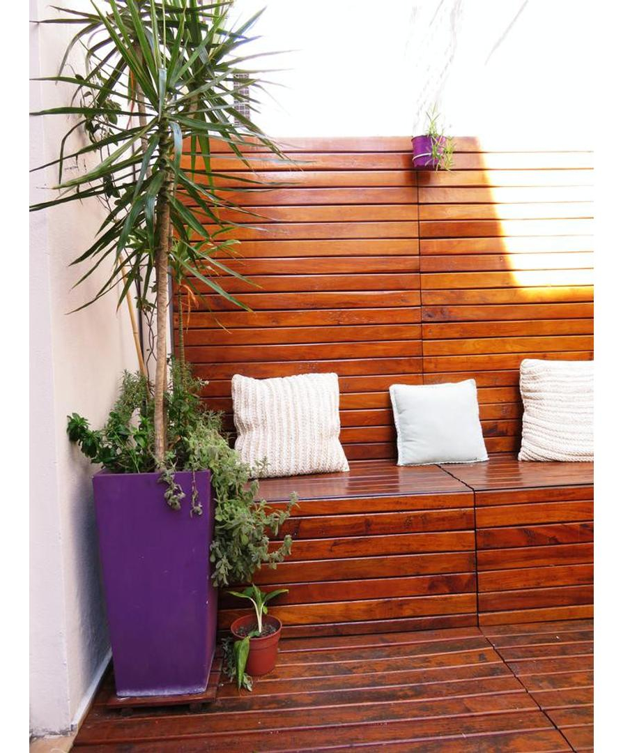 - Deck que reviste la mitad del piso y una de las paredes laterales, el cual incluye un banco para 3 personas que a su vez es baulera.