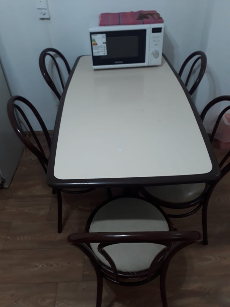 Ademas un estar con diván cama, mesa sillas y heladera grande, anafe eléctrico, horno microondas con Sommiers.