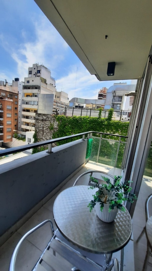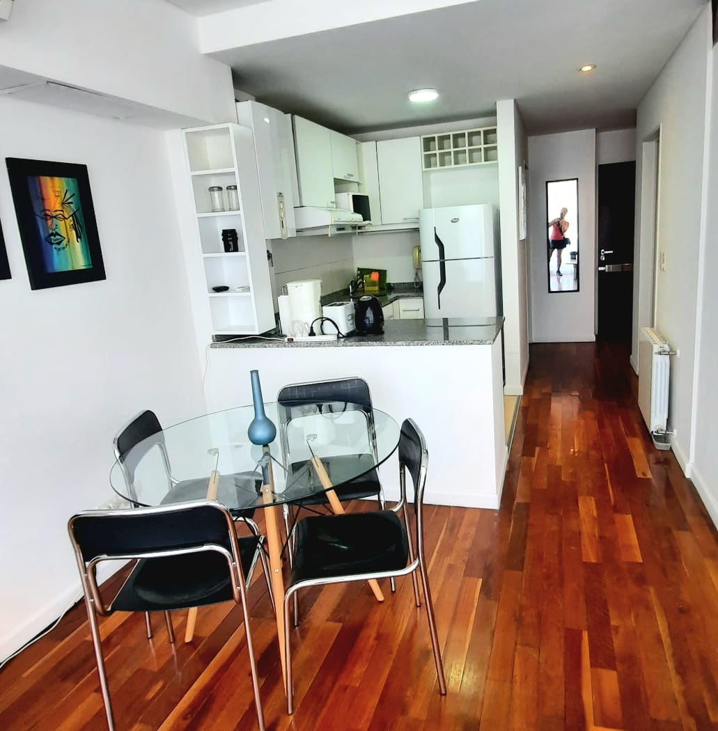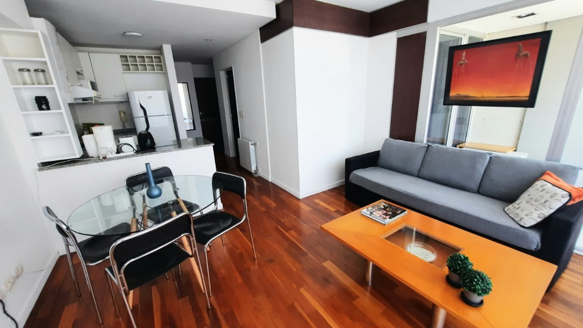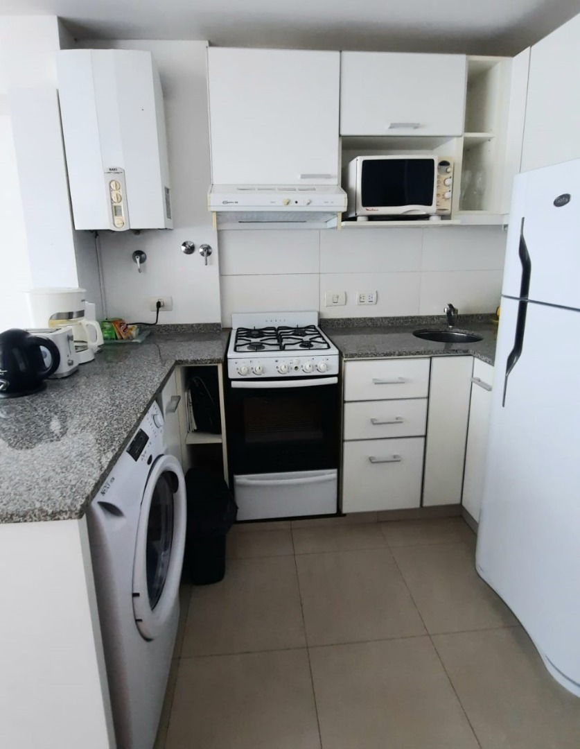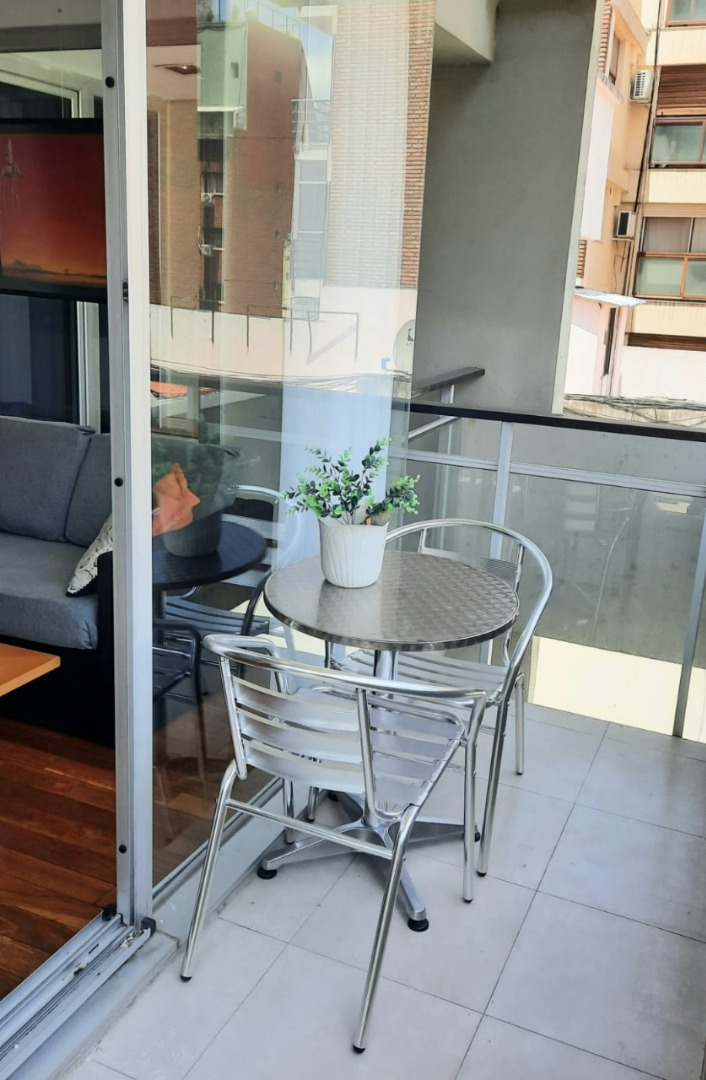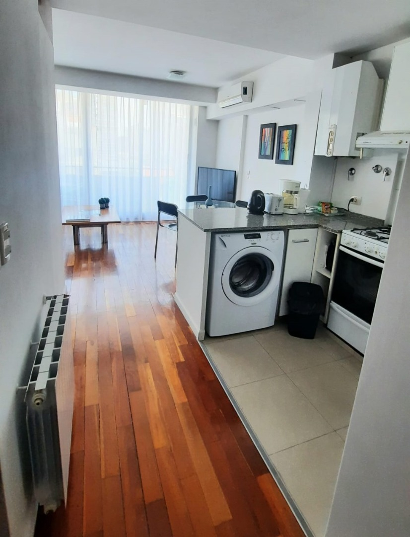 El departamento cuenta con living amplio con sillón, mesa ratona, televisión, mesa con sillas, aire acondicionado, balcón al frente por ventanal de vidrio con cortina. Cocina con estufa, barra desayunadora, microondas, heladera con frezzer, bajo mesada, alacena, utensilios de cocina, cafeteras, tostadora. Tolette de recepción con inodoro y lava manos con espejo. Habitación con cama matrimonial dude dos plazas, mesas de luz, placard. Baño co ducha, inodoro, bidé, lava manos. Cuenta con balcón. Cuenta con lavarropas automático.