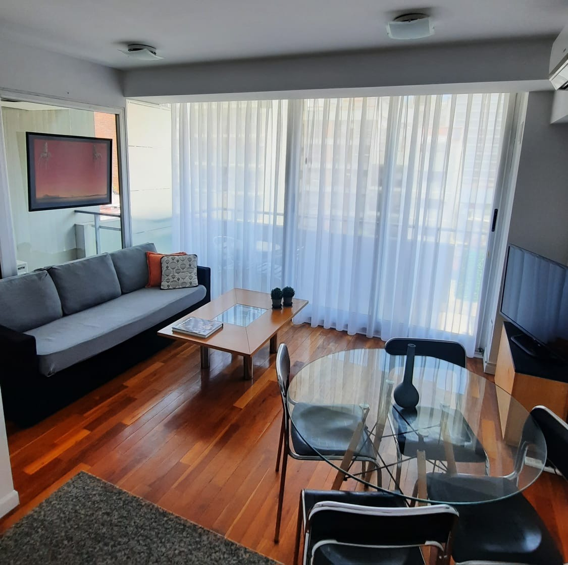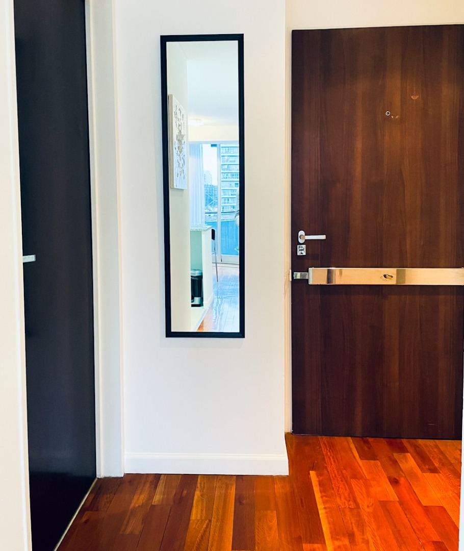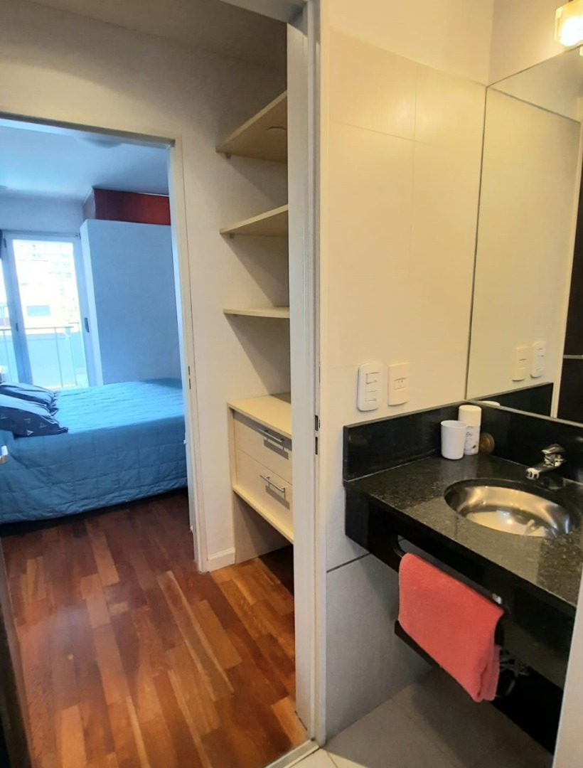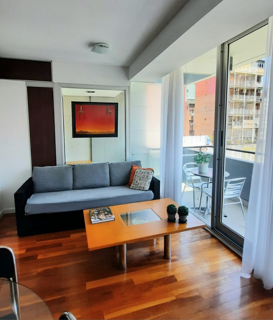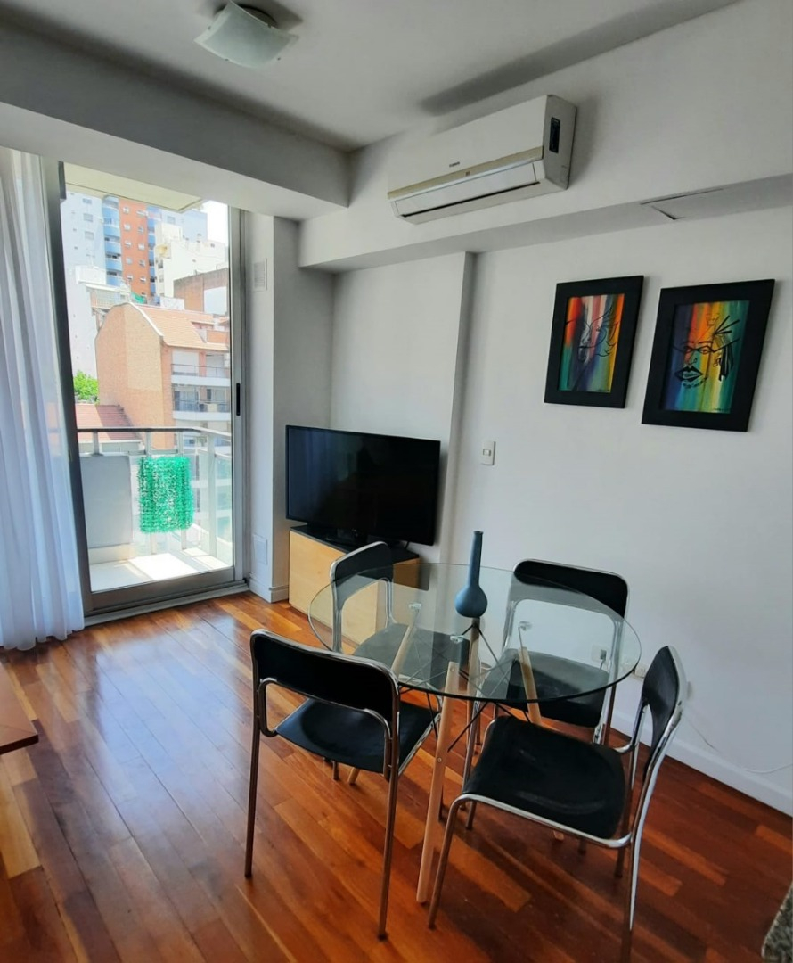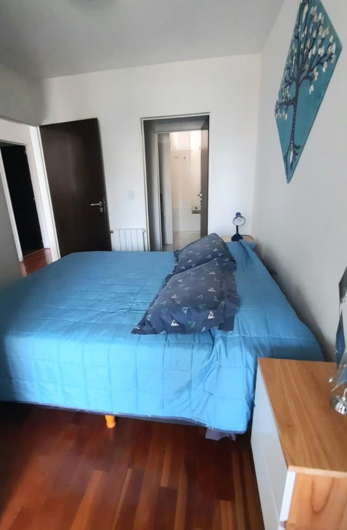 El departamento cuenta con living amplio con sillón, mesa ratona, televisión, mesa con sillas, aire acondicionado, balcón al frente por ventanal de vidrio con cortina. Cocina con estufa, barra desayunadora, microondas, heladera con frezzer, bajo mesada, alacena, utensilios de cocina, cafeteras, tostadora. Tolette de recepción con inodoro y lava manos con espejo. Habitación con cama matrimonial dude dos plazas, mesas de luz, placard. Baño co ducha, inodoro, bidé, lava manos. Cuenta con balcón. Cuenta con lavarropas automático.