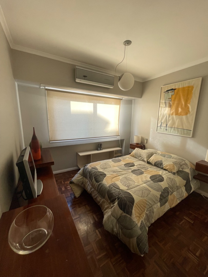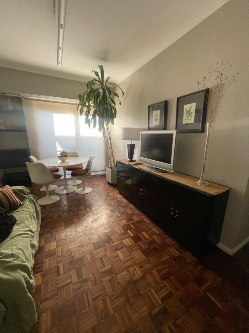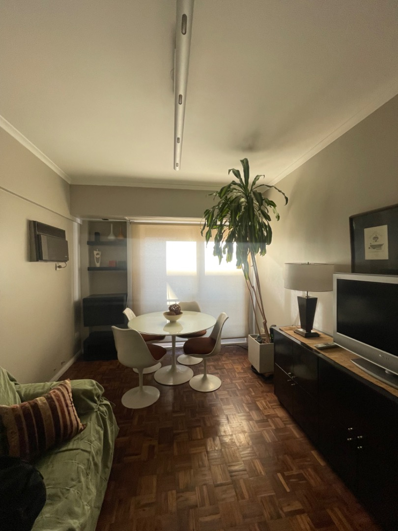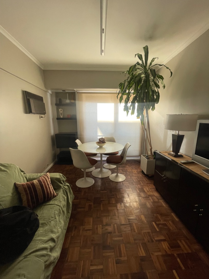El departamento cuenta con living con sillón, televisión, mesa con 4 sillas, muy luminoso con salida directa al balcón.