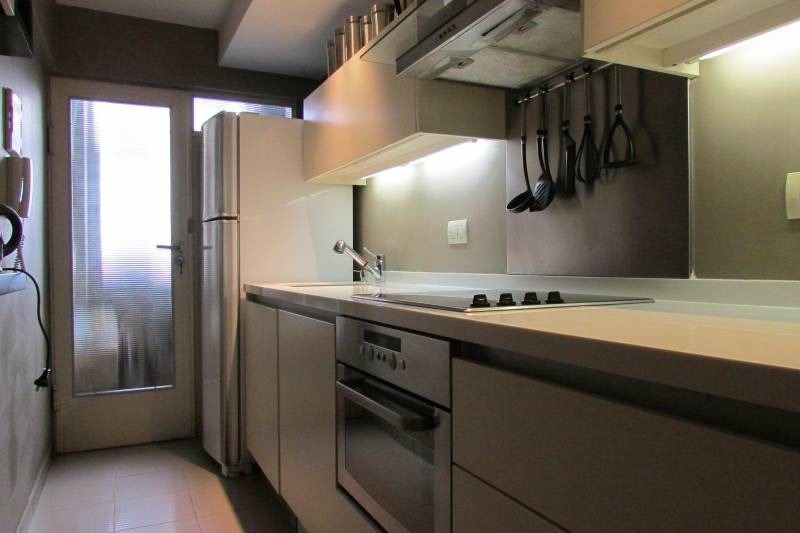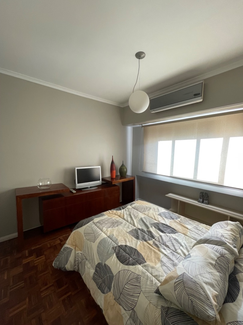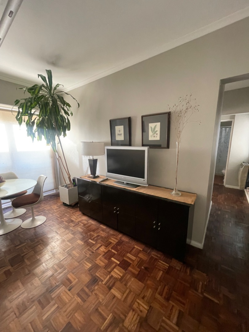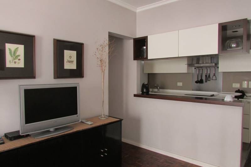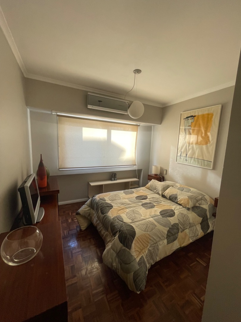 El departamento cuenta con living con sillón, televisión, mesa con 4 sillas, muy luminoso con salida directa al balcón.