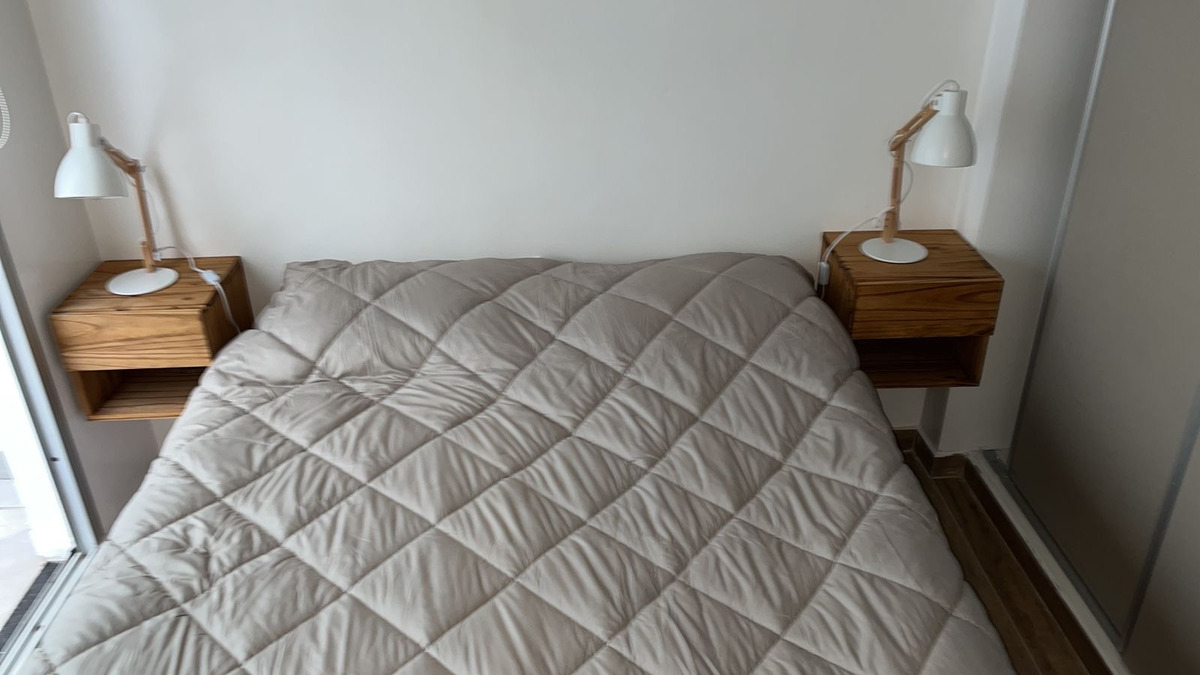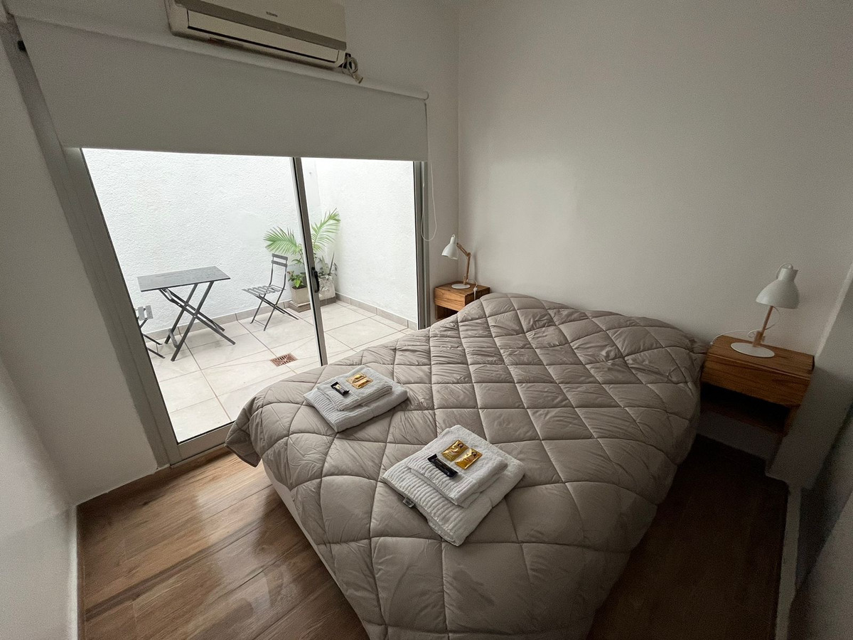 Habitación con cama de dos plazas con dos mesas de luz con lamparas, placard, cuenta con salida directa al patio por ventanal muy luminoso.