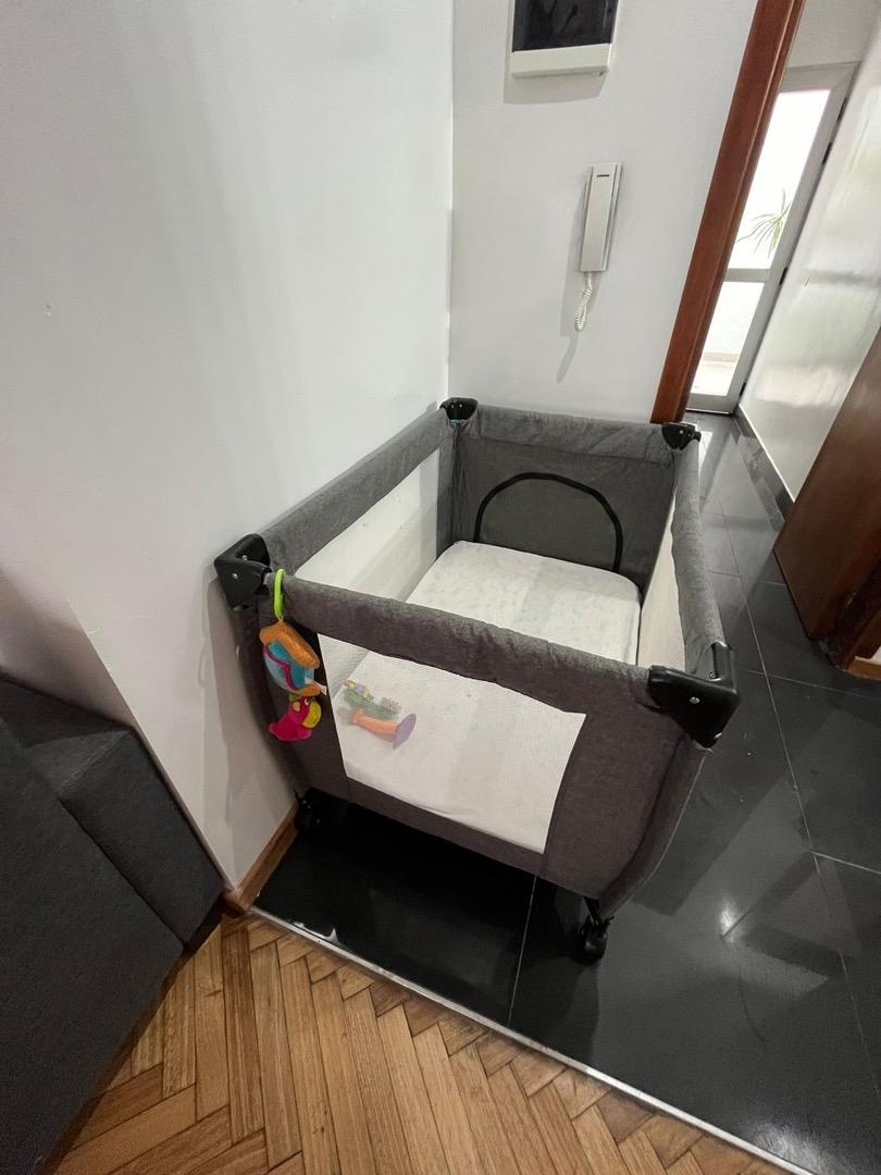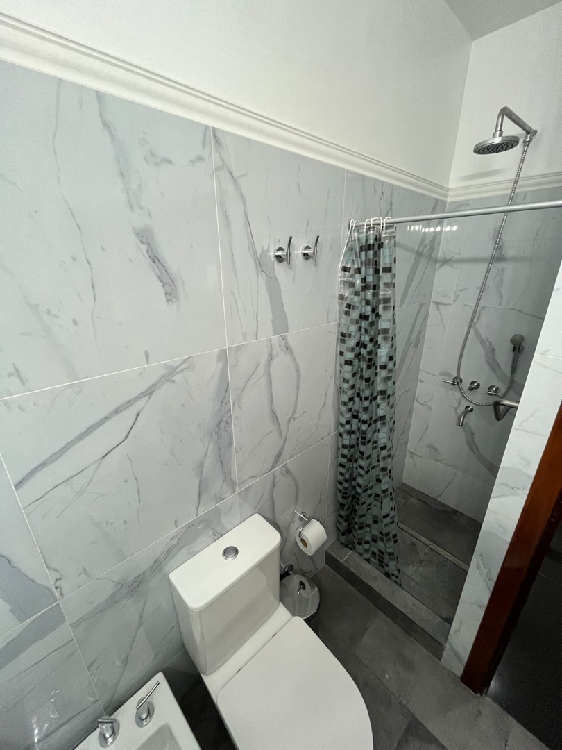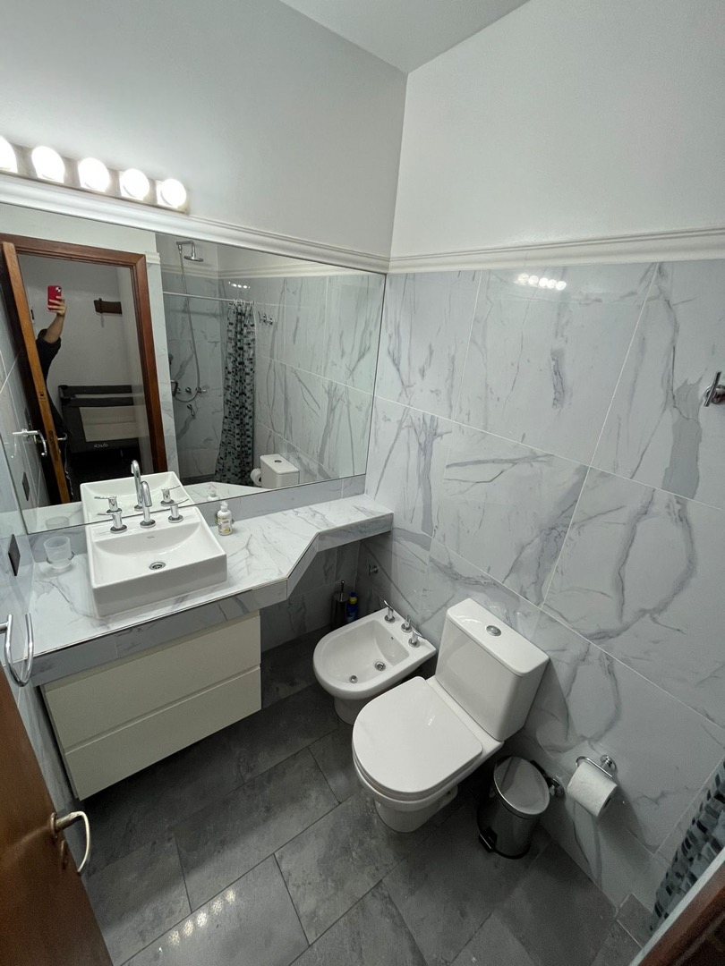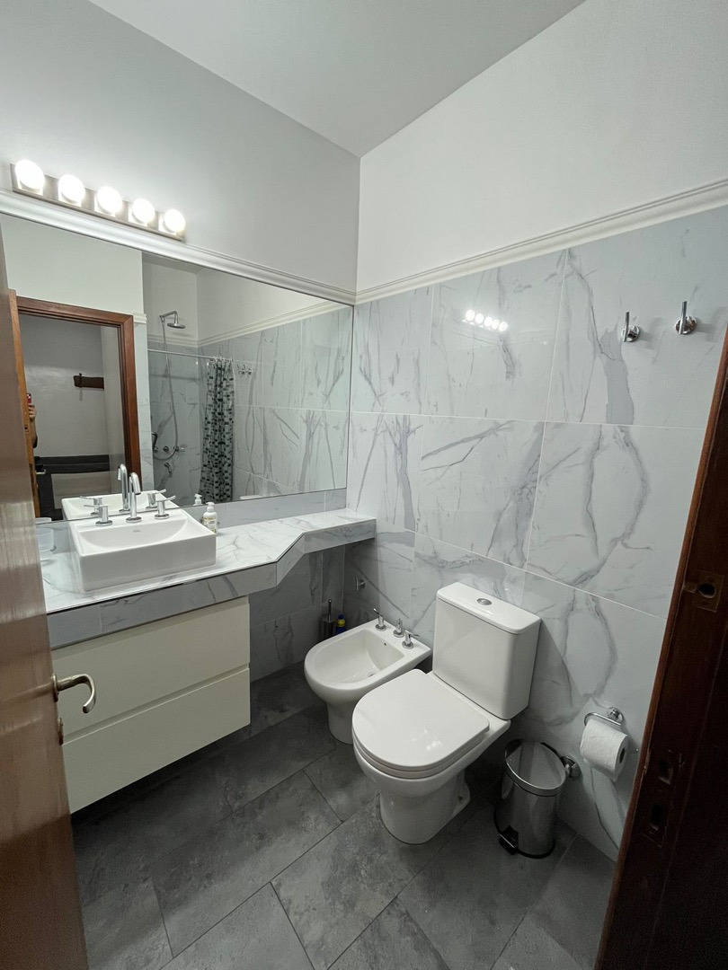 Baño amplio con bidé, inodoro, lava manos con espejo amplio ducha, cuenta con una cuna.