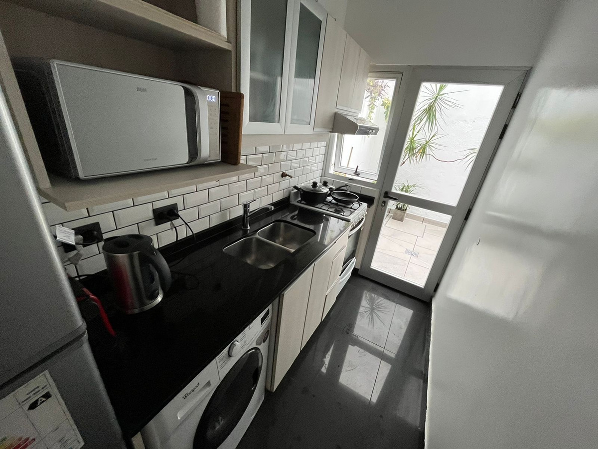 Cocina equipada completa con heladera con frezzer, microondas, cocina con horno a gas, utensilios de cocina, cafetera, pava eléctrica, lavarropas automático, alacena y bajo mesada.