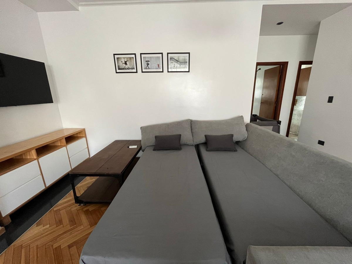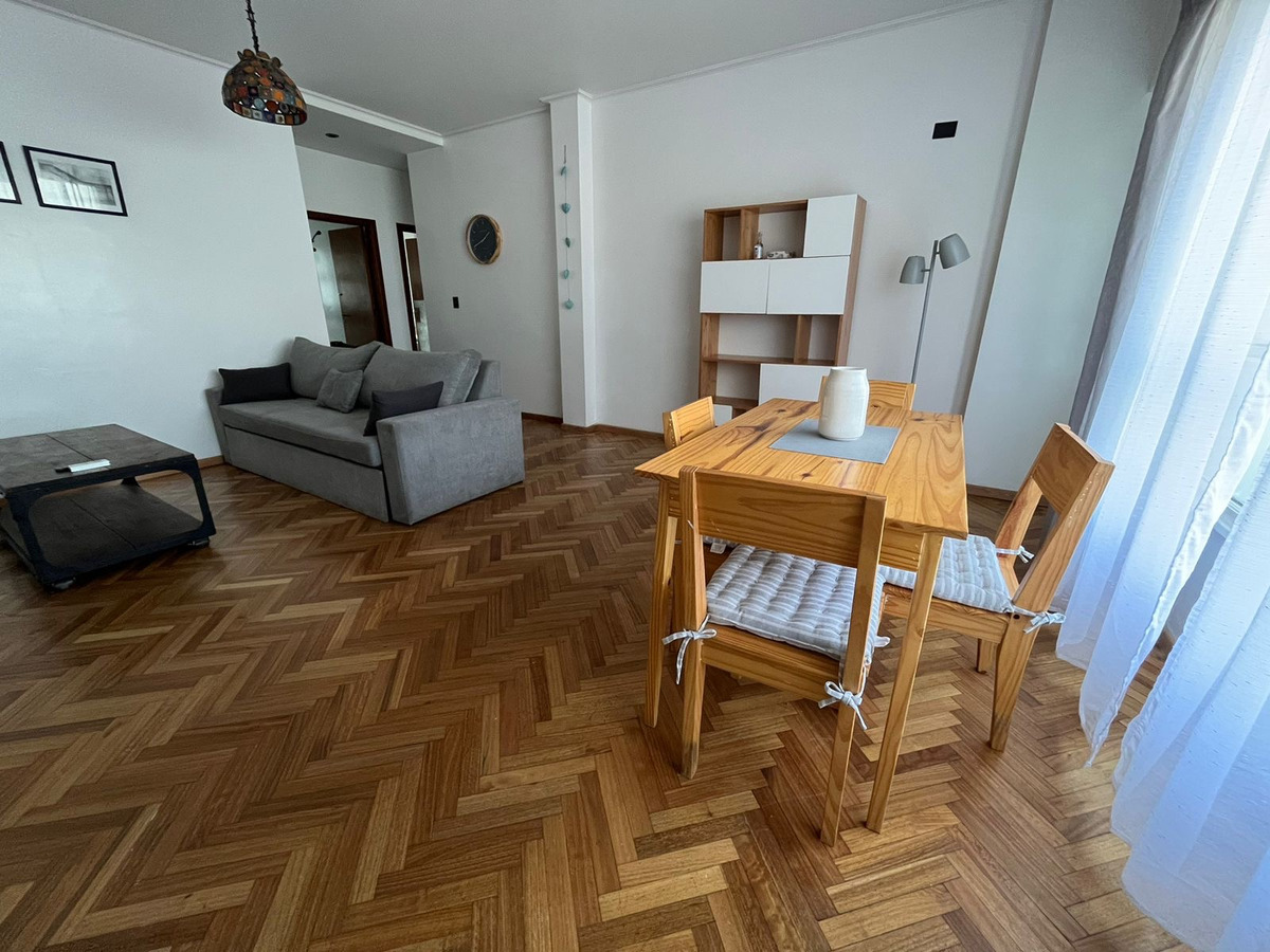 El departamento cuenta con living amplio con pisos de parque, sillón que se hace cama, con mesa ratona, televisión con mueble para TV, mesa con sillas, aire acondicionado.
