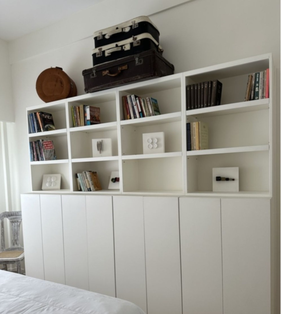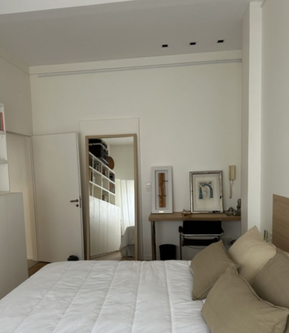 -El dormitorio principal contiene placard, biblioteca, espejo, escritorio con silla, mesa de luz, cama de 2 plazas y aire acondicionado.