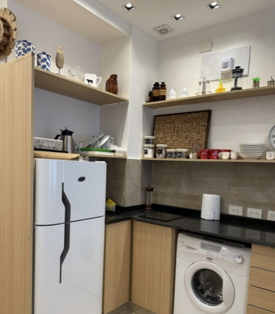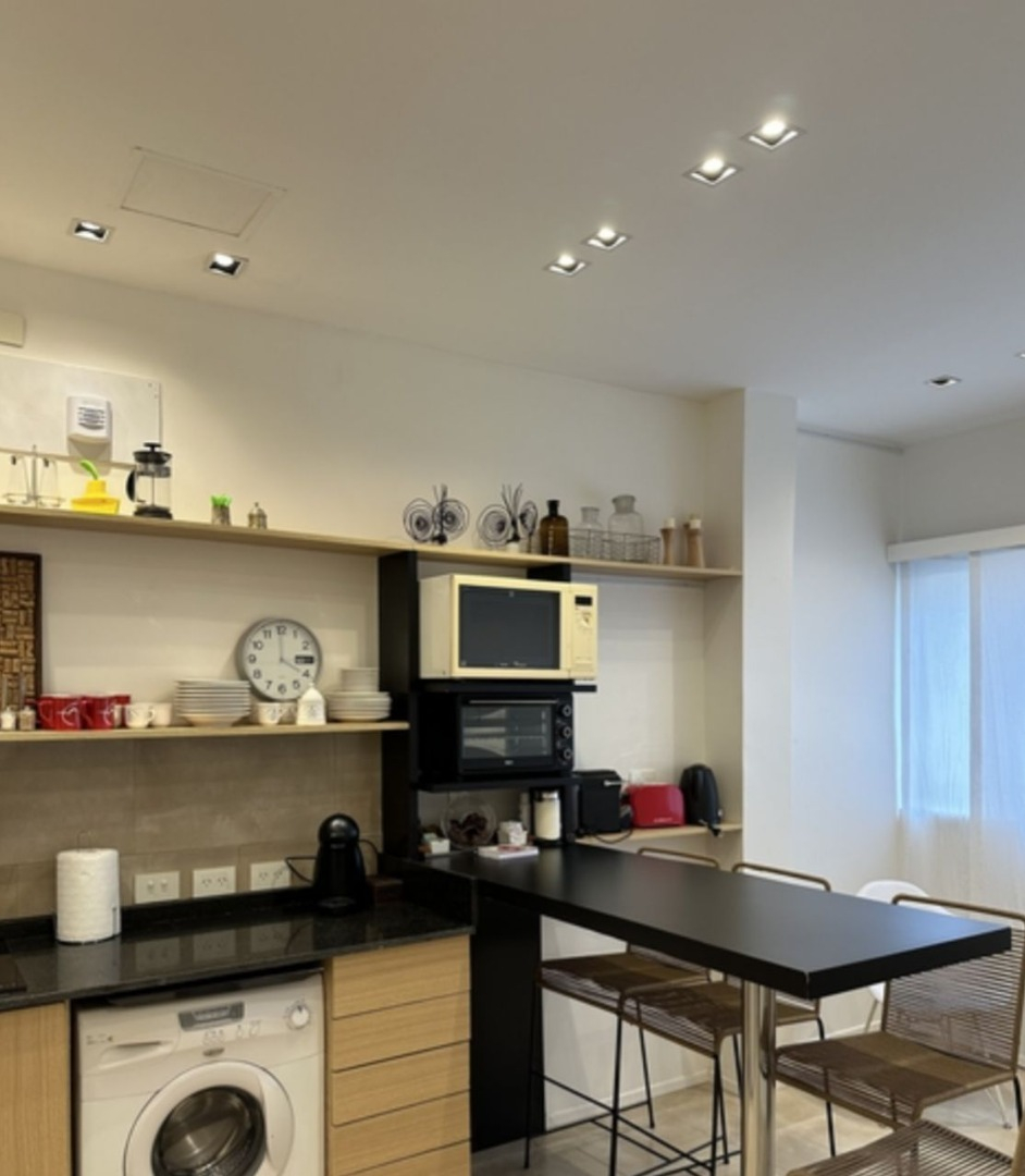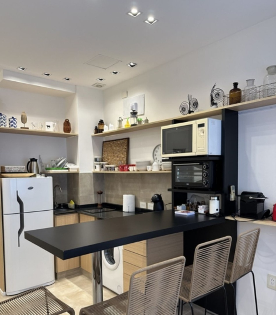 -El departamento contiene cocina totalmente equipada con microondas, horno electrico, pava electrica, cafetera, tostadora, anafe electrico, heladera con freezer y lavarropas, Barra desayunadora con 3 sillas.