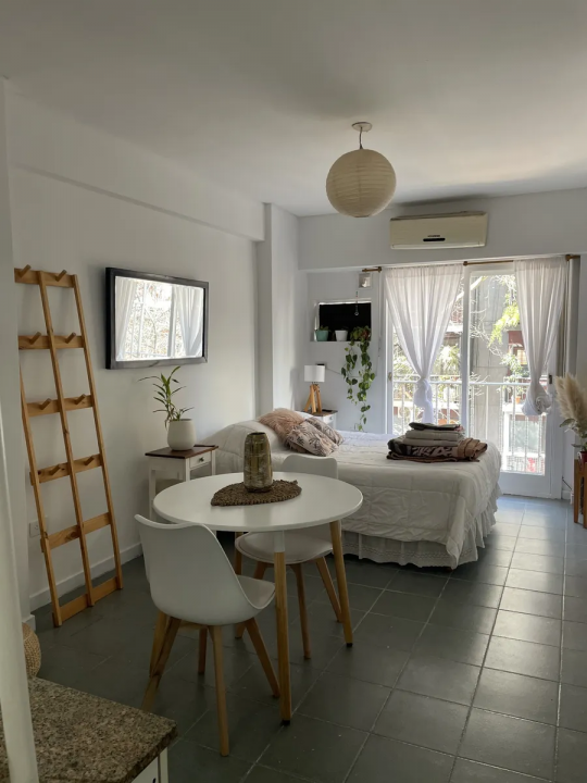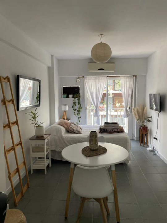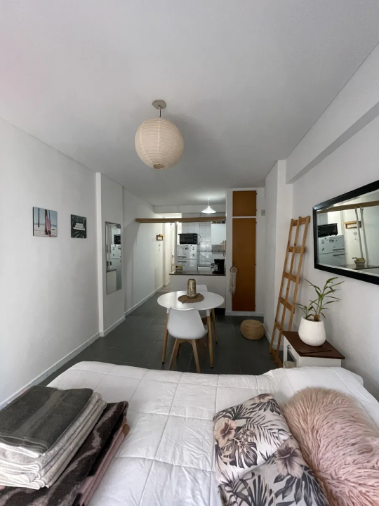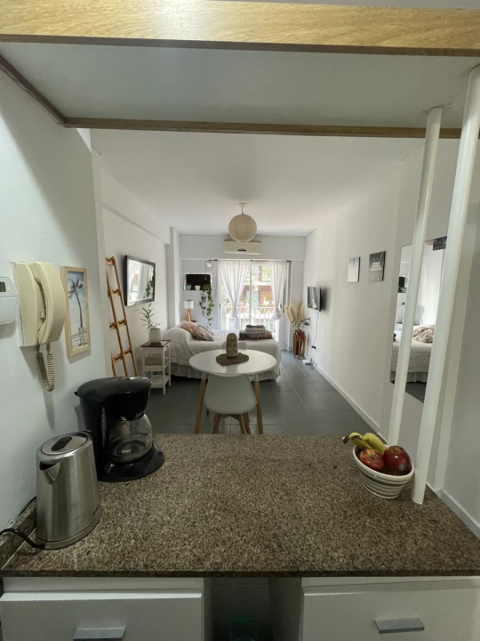 Completamente amoblado con cama de dos plazas, Smart Tv para que puedas colocar tus usuarios streaming, heladera, cocina con anafes electricos, horno eléctrico, microondas, cafetera, tostadora, licuadora, vajilla. Baño completo con bañera, placard de guardado y mesa con dos sillas.