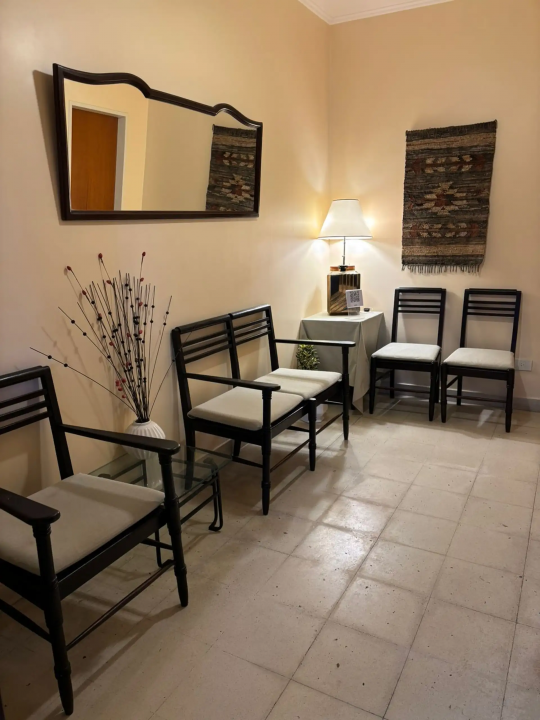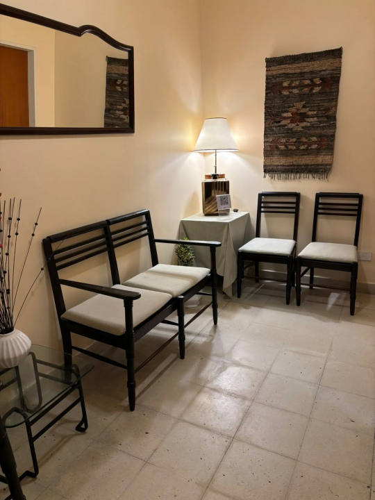 Sala de espera con capacidad para 5 personas, equipada con toilette y parlante de música funcional controlable desde el consultorio.
