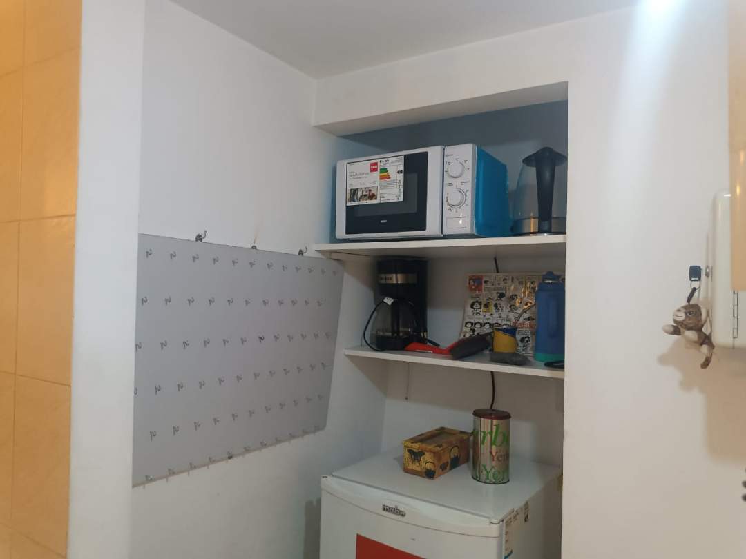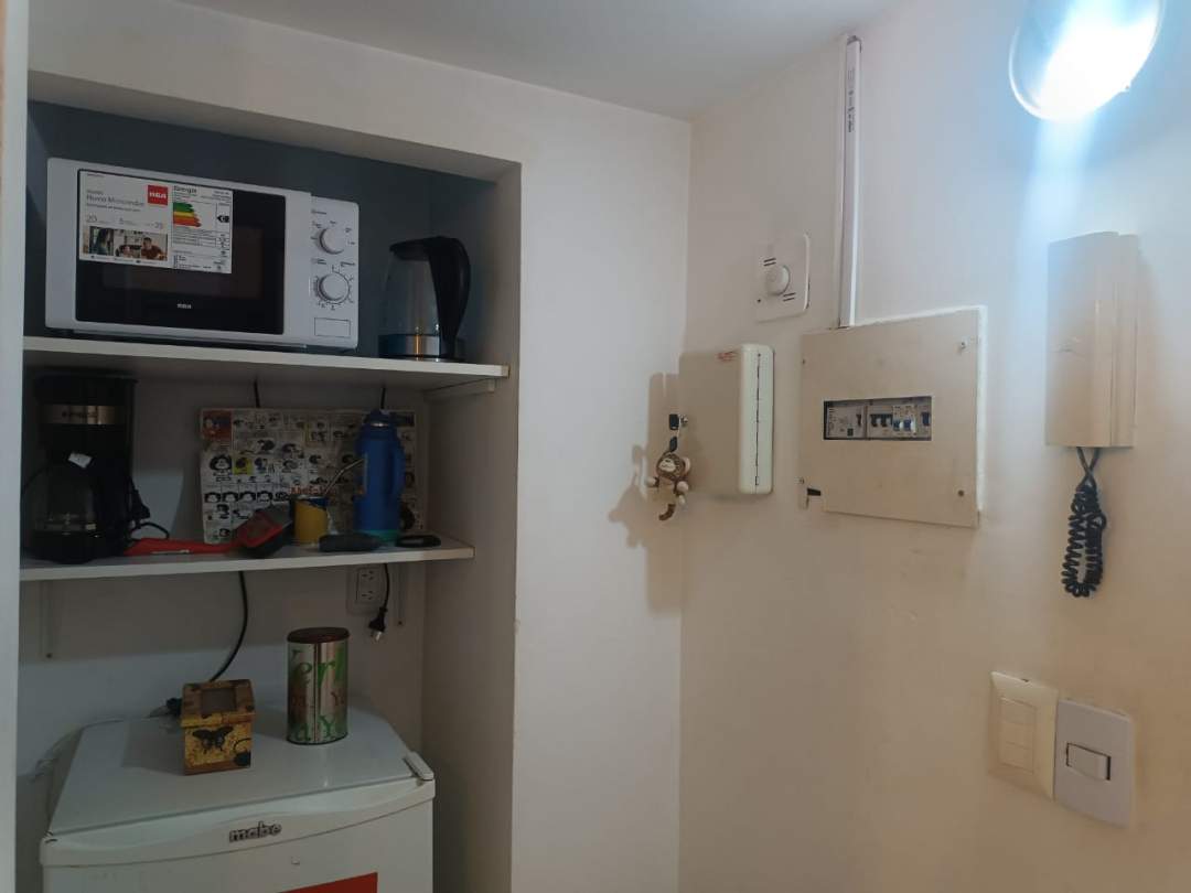 -Un espacio con lockers, heladera bajo mesada, microondas, pava electrica y cafetera
